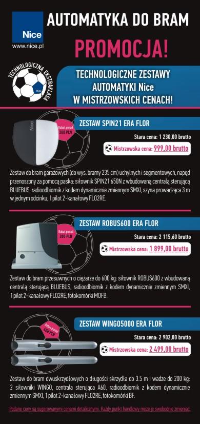 Do Technologicznej Ekstraklasy Nice zaliczone zostały trzy flagowe zestawy automatyki, które pozwolą na automatyzację każdego rodzaju wjazdu. Zestaw Robus600 to najlepsze rozwiązane do automatyzacji bram przesuwnych o ciężarze nawet 600kg. Dla bram skrzydłowych odpowiednim wyborem jest zestaw Wingo5000, natomiast z napędów do bram garażowych do Technologicznej Ekstraklasy Nice został zakwalifikowany zestaw SPIN21.