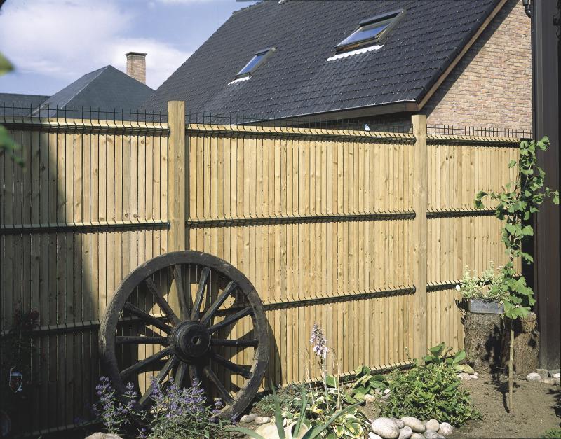 Ogrodzenie lamelowe – rozwiązanie lżejsze od ogrodzenia betonowego, ale wiąże się z nim ciężka praca przy regularnej konserwacji i malowaniu, które może być konieczne już po jednym sezonie.