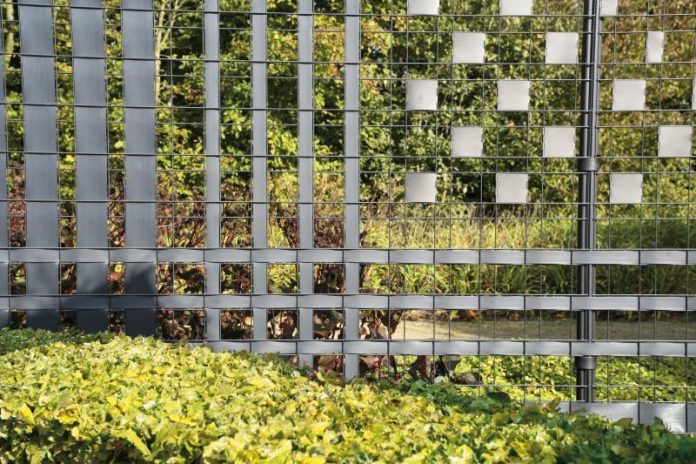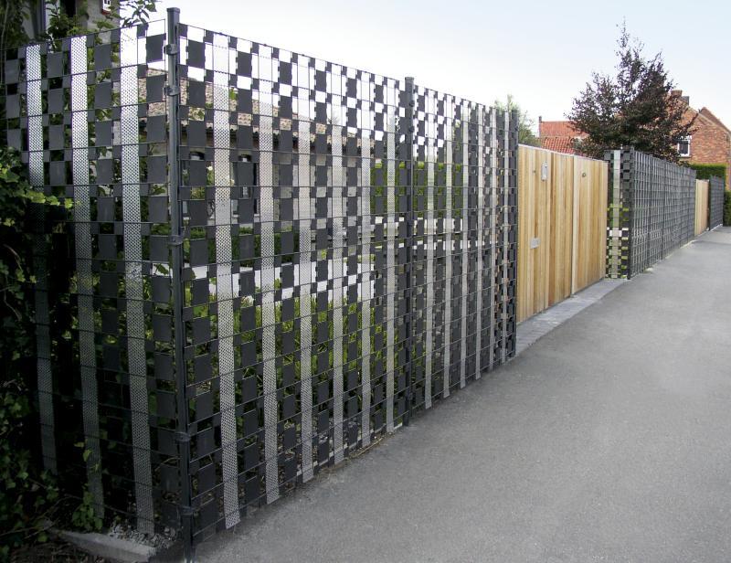 - Wypełnić taśmą panele na całej długości ogrodzenia lub tylko w wybranej jego części – na przykład od strony ogródka, pozostawiając część frontową przezierną