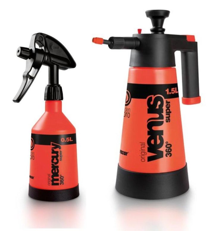Mercury Super 360 o pojemności 0,5l oraz 1l idealnie sprawdzi się przy pielęgnacji niewielkich choinek w doniczkach. Unikatowy system oprysku Double Action® dodatkowo zwiększa jego wydajność – rozpylenie cieczy następuje zarówno przy naciśnięciu jak i zwolnieniu dźwigni pompki. Venus Super 360 (dostępny w wersji 1l, 1,5l oraz 2l) to z kolei ręczny opryskiwacz ciśnieniowy, który umożliwia wykonanie oprysku regularnym, stałym strumieniem na większych choinkach. Zupełnie nowa konstrukcja głowicy i poprawiona końcówka rozpylająca zwiększają zawirowanie cieczy, a ruchoma końcówka dodatkowo pozwala na swobodną regulację kąta oprysku.