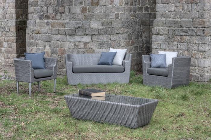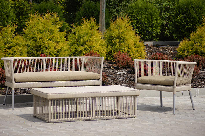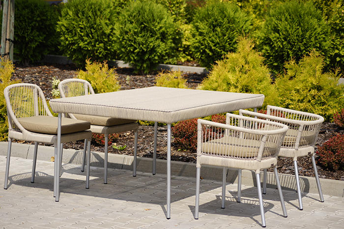 Meble ogrodowe zostały wykonane z najwyższej jakości plecionki rattanu syntetycznego. Jest to bardzo trwały, odporny na wszelkie czynniki atmosferyczne materiał. Stelaże składają się z uszlachetnionego aluminium, które gwarantuje wytrzymałość mechaniczną oraz sprawia, że meble są lekkie i komfortowe. Dzięki czemu zmiana aranżacji na tarasie, w ogrodzie, bądź oranżerii nie sprawia najmniejszego problemu. Dodatkowo tworzywo jest odporne na rdzę oraz wszelkie zarysowania. Tkaniny użyte do produkcji zostały zaprojektowane z myślą o meblach ogrodowych. Pokryte są teflonem, co zatrzymuje wchłanianie wody, jak i zmniejsza ryzyko zabrudzeń. Poduszki zostały wypełnione pianką tapicerską, która odporna jest na wszelkie odkształcenia. A co najważniejsze – meble są w 100 % ekologiczne i przyjazne dla środowiska!