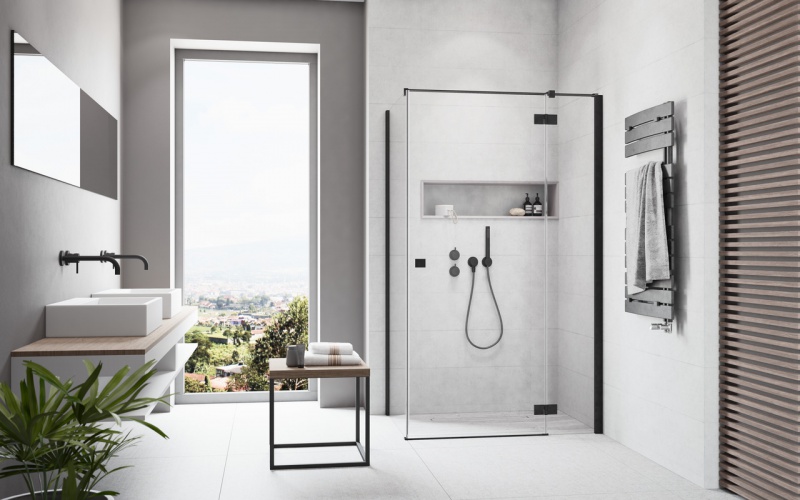 Kabina prysznicowa Essenza New Black KDJ została stworzona z myślą o najnowszych trendach w projektowaniu łazienek. Dzięki nowoczesnej formie oraz dbałości o detal doskonale wpisuje się w modernistyczny styl pokoi kąpielowych. Drzwi w kabinie Essenza New KDJ Black otwierane są na zewnątrz. Kabina wykonana jest ze szkła hartowanego o grubości 6 mm, dostępna jest w kilku wariantach kolorystycznych – brązowym, grafitowym, satynowym, Pixarena, Mirror oraz UltraClear. W modelu tym zawiasy zostały zlicowane ze szkłem. Powstała w ten sposób płaska powierzchnia pokryta dodatkowo specjalną powłoką EasyClean, pomaga utrzymać kabinę w czystości. To sprawia, że użytkowanie staje się proste i przyjemne. Najważniejszymi wyróżnikami tego modelu są zawiasy, uchwyty, wsporniki wykonane w kolorze czarnym. Dzięki nim kabina zyskała niepowtarzalnych charakter. Dodatkową zaletą jest możliwość zamówienia produktu na wymiar i wykonania graweru na podstawie indywidualnego motywu lub wzoru dostępnego w ofercie firmy Radaway.