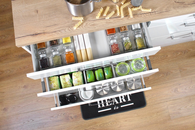 Optymalnemu wykorzystaniu kuchennej przestrzeni sprzyjają też systemy szuflad Comfort Box z pełnym wysuwem (sprawdzą się nawet w najmniejszych kuchniach). Rozwiązania te dostępne są w różnych rozmiarach i wysokościach, a ponadto – w dwóch opcjach: jako szuflady frontowe lub wewnętrzne.