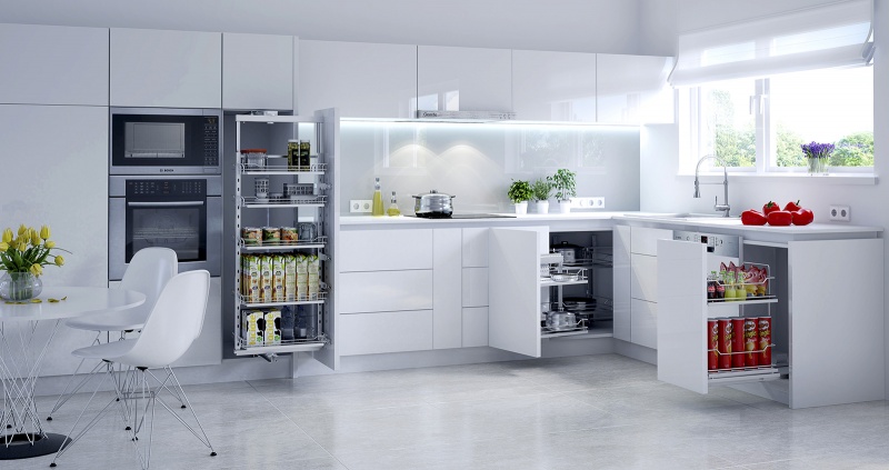 Najtrudniejszymi do zagospodarowania szafkami są te narożne. Jednak i na nie producent wyposażenia mebli z Rypina znalazł sposób, tworząc system Corner Optima pozwalający na wysuwanie poszczególnych półek z szafek narożnych płynnym, falistym ruchem bez ryzyka upadku ustawionych na nich produktów. Z kolei Corner Front i Corner Comfort, wyposażone w stabilne tory jazdy, pozwalają na wysunięcie całej zawartości narożnej szafki.