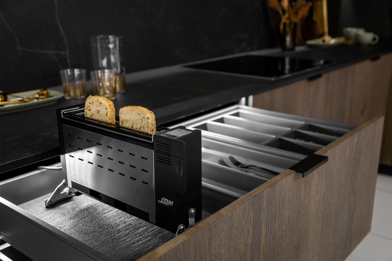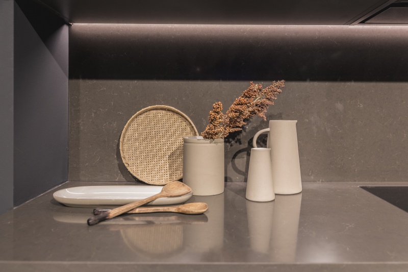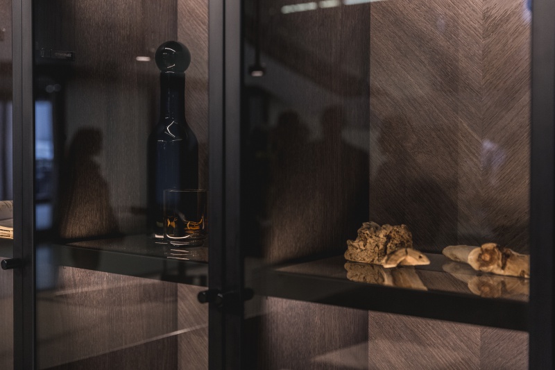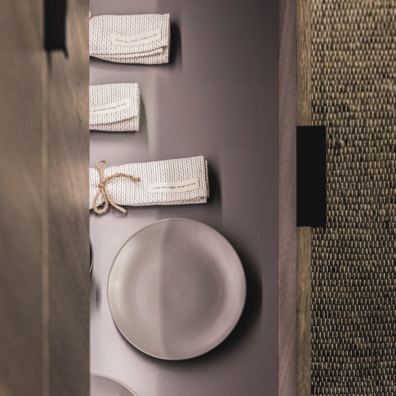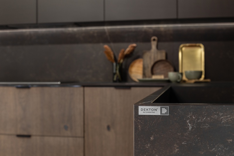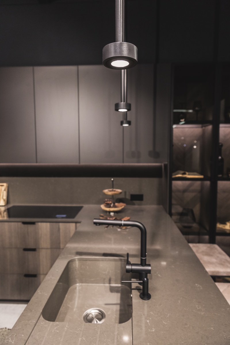 Kuchnia oblana kolorami brązu to rozwiązania dla szerokiej grupy odbiorców, z jednej strony może znaleźć zastosowanie w loftowych wnętrzach, z drugiej w małych apartamentach – przestrzeń nie stawia tu żadnych ograniczeń, jest jedynie dopełnieniem i kontekstem dla całości. Autorskie smaczki, takie jak: witryny z ramką aluminiową z przydymionym szkłem, systemy przechowywania ukryte w zabudowie przyściennej czy też blat wykonany z konglomeratu kwarcowego marki Cosentino ze zintegrowanym zlewem i ociekaczem, podkreślają funkcjonalny charakter kuchni.