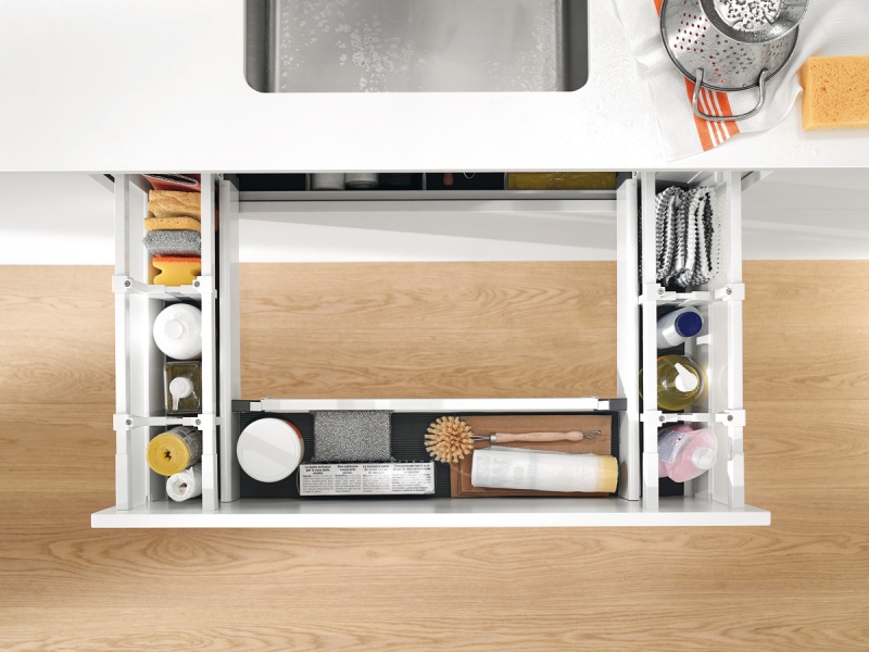 Zamiast tradycyjnego kosza ukrytego za drzwiczkami, warto pomyśleć o szufladzie z pełnym wysuwem, która zagwarantuje optymalny dostęp do każdego z sortowników na śmieci i wykorzysta w pełni przestrzeń wewnątrz szafki. Zmieścimy w niej również duże detergenty. Jeszcze więcej przestrzeni uzyskamy, jeśli dodamy w tym miejscu szufladę wewnętrzną ukrytą za frontem.