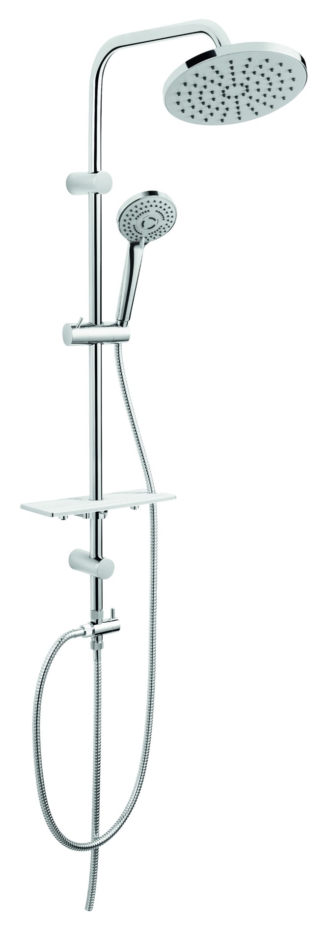 Przestrzeń prysznica usytuowaną we wnęce pomieszczenia połączono z obudowaną pastelowymi płytkami prostokątną wanną, co sprawia, że wspaniale harmonizuje ona ze strefą umywalki. Ozdabia ją zestaw natryskowy Rondo Lux z baterią wannową należącą do królującej w łazience kolekcji FERRO ONE. Elegancki zestaw z głowicą talerzową o średnicy 20 cm oraz 3-funkcyjną rączką natrysku z systemem łatwego usuwania kamienia wapiennego zapewnia wygodę podczas codziennej pielęgnacji. Należy do niego także praktyczna półka na kosmetyki, którą zgodnie z potrzebą można zamontować na dowolnej wysokości. Bateria towarzysząca prysznicowi pokryta została dekoracyjną chromowaną powłoką i wyposażona w regulator ceramiczny oraz ceramiczny przełącznik wanna/natrysk z zaworem zwrotnym. Ten łazienkowy duet, pozwala zarówno na relaksującą kąpiel, jak i przyjemny prysznic. Dla komfortu użytkownika w zasięgu ręki na ścianie zamontowano ozdobną szklaną półkę, która w połączeniu z półką w zestawie znacznie powiększa przestrzeń na środki do mycia i kosmetyki. Obok natrysku znalazł się też funkcjonalny grzejnik w białej barwie. Jest na tyle blisko wanny, że kąpiący bez trudu dosięgnie ręczników zawieszonych na rurkach bądź na przyczepionych do nich uchwytach.