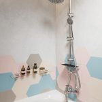 W przedstawionej łazience ścianę zdobią płytki w formie sześcioboku, które zestawione ze sobą przypominają plaster miodu. Odcienie beżu, kremu, niebieskiego i brudnego różu świetnie współgrają z bielą ścian i innych dodatków wyposażenia oraz jasną posadzką. Strefę umywalki ozdabia duże okrągłe lustro, a także zamontowana poniżej na prostokątnym blacie umywalka o delikatnie zaokrąglonych krawędziach, z którą udaną parę tworzy bateria FERRO ONE. Posiada ona praktyczną obrotową wylewkę i regulator ceramiczny, a dzięki łagodnej opływowej linii korpusu i uchwytu oraz chromowanej powłoce idealnie wpisuje się w aranżację pomieszczenia. Obok podłużnej umywalki znalazło się wystarczająco dużo miejsca na akcesoria niezbędne do pielęgnacji. W strefie tej nie mogło zabraknąć również estetycznego wieszaka na ręczniki i subtelnie oświetlającej całość wiszącej lampy z nowoczesnym lekko pozłacanym kloszem.