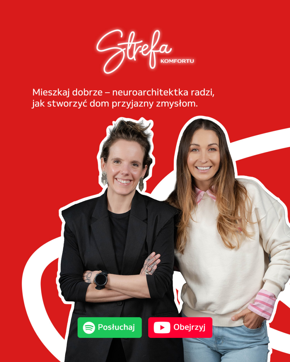 Przez dekady w architekturze rządziła estetyka. Choć wciąż odgrywa bardzo ważną rolę, dziś coraz częściej skłaniamy się ku rozwiązaniom sprzyjającym naszej codzienności, odpoczynkowi i relaksowi. O zastosowaniach neuroarchitektury w projektowaniu wnętrz rozmawiały Ola Kot oraz Joanna Jurga w szóstym odcinku videocastu Strefy Komfortu “Mieszkaj dobrze – jak stworzyć dom przyjazny zmysłom?“