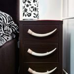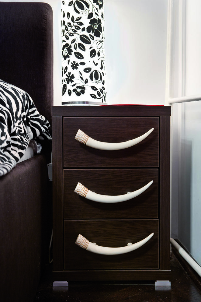 Co ciekawe koncepcja łóżka, od pomysłu jak ma wyglądać do ustawienia w sypialni, została zrealizowana w 3 godziny i wszystko było gotowe. Projekt został zrealizowany w rodzinnej fabryce mebli w Węgrowie. I choć, wydawałoby się, że połączenie stylu nowoczesnego z elementami dzikich skór jest trudne, aby osiągnąć spójność, to meble zakupione w antykwariacie świetnie łączą ze sobą te dwa koncepty. Sofa i fotele, stylizowane na pochodzące z czasów Ludwika, stały się nie tylko niezwykłą ozdobą salonu ale, także tworzą pole do eksperymentów Pani Ewy. Jako technolog drewna prowadzi na nich próby renowacyjne. Obecnie zostały „obrobione”, czego efekt jest widoczny na zdjęciach.
