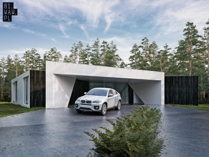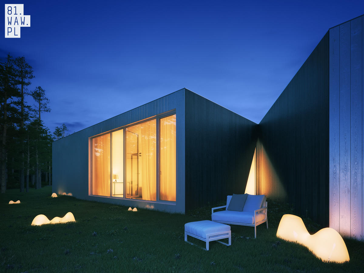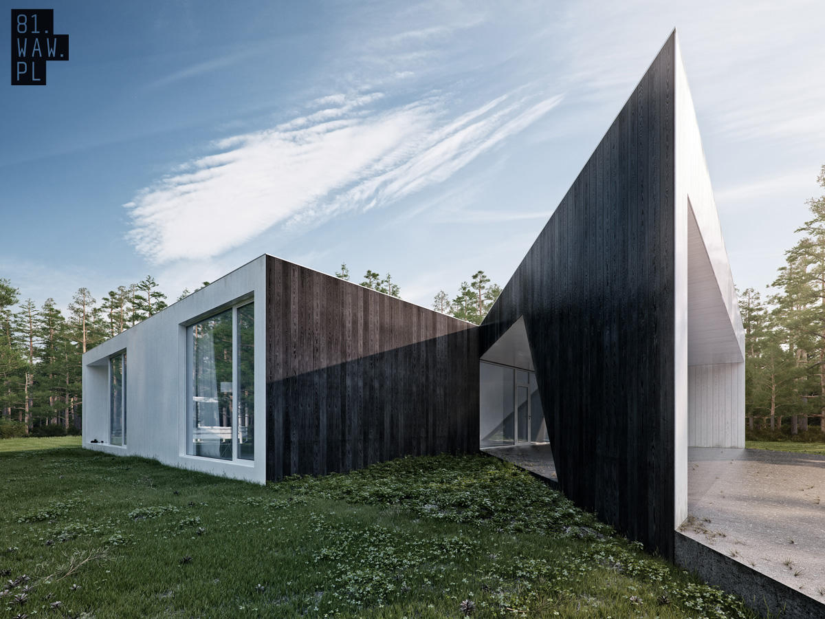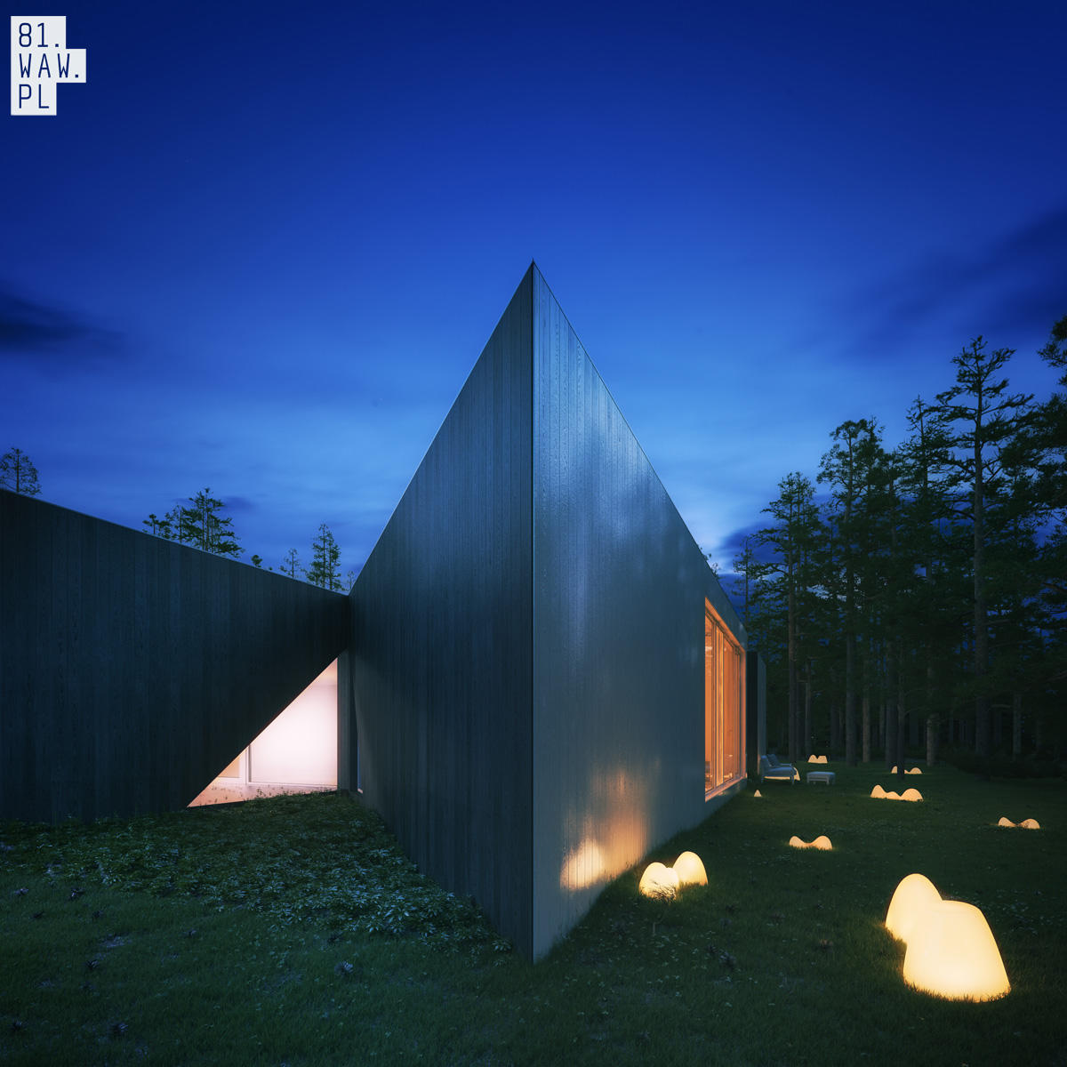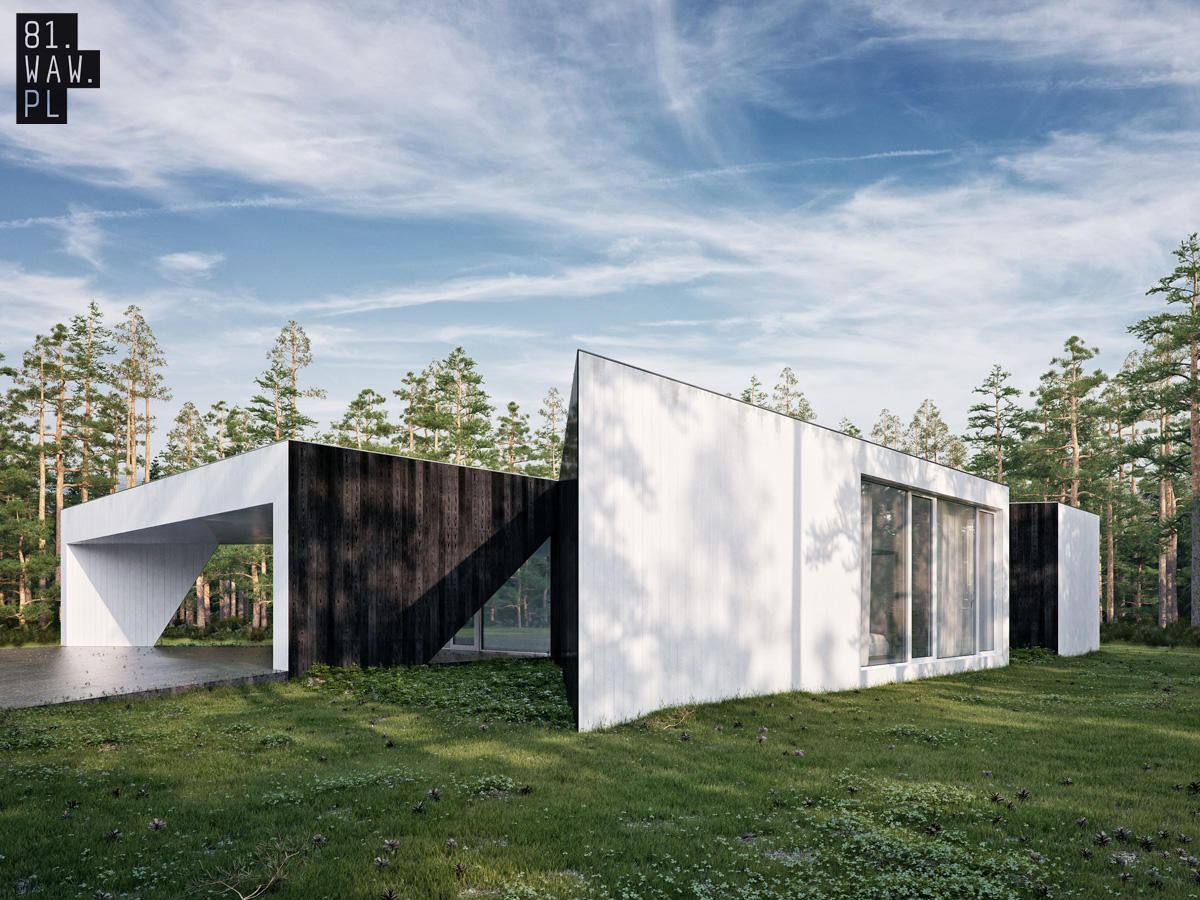 Punktem wyjścia warszawskich architektów z pracowni 81.WAW.PL było stworzenie domu na planie kwadratu. Jednakże, aby zapewnić doświetlenie w centralnej części budynku oraz w części pomieszczeń w każdym narożniku budynku zaplanowano trójkątne wcięcie. – Na końcu każdego wcięcia umieściliśmy okna, które mają za zadanie doświetlić łazienki i pomieszczenia techniczne – zaznacza Rafał Grudziąż, architekt. Dzięki powstaniu wcięć uzyskaliśmy także kształt domu, który w rzucie przypomina śmigło – dodaje Grudziąż.