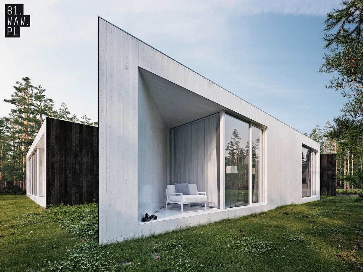 Z zewnątrz bryła budynku została obłożona deskami malowanymi na biało. W miejscach wcięć zastosowano taki samo rodzaj deski, jednakże dla kontrastu pomalowanej na czarno. Dzięki temu budynek zyskał niezwykle interesujący, dynamiczny charakter.