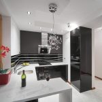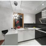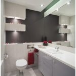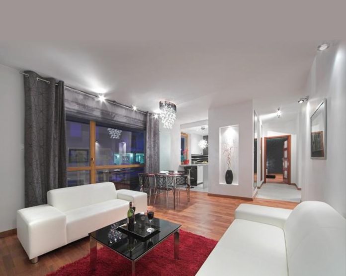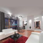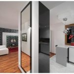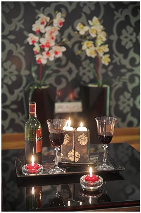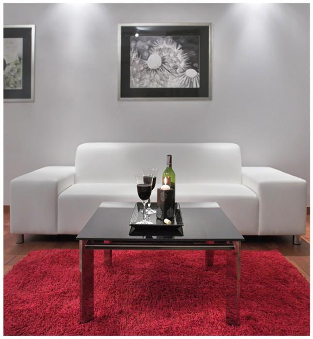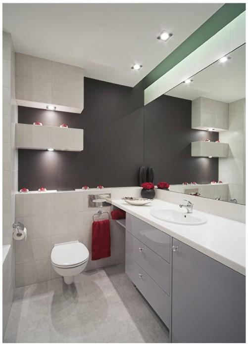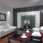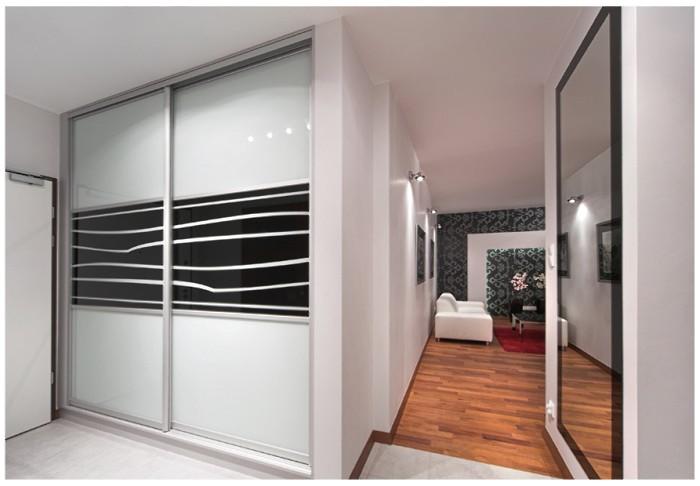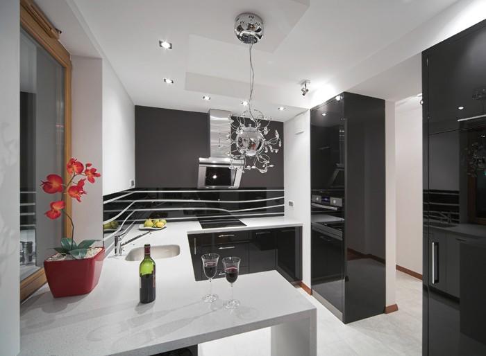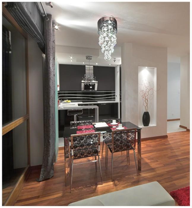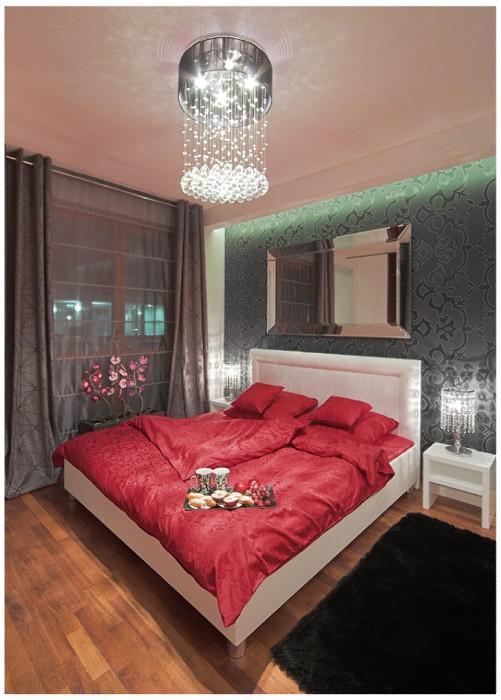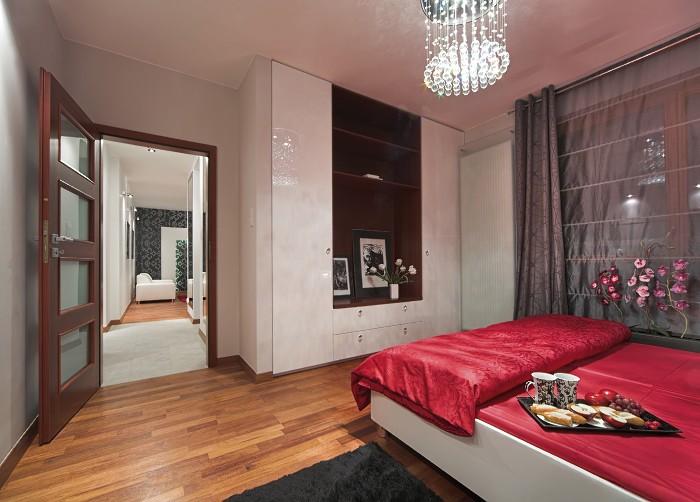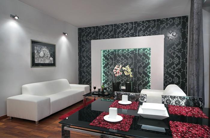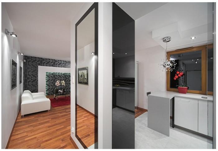 Połyskująca biel odbija czarne refleksy, czerń natomiast absorbuje światło – całość tworzy interesujące efekty wizualne. Duże płaszczyzny luster powiększają wnętrze. Nasycone kolory czerwonego wina ciekawie podkreślają i uzupełniają proste formy mebli. Materiały takie jak kryształ, szkło i lustra nadają lekkości kompozycji.