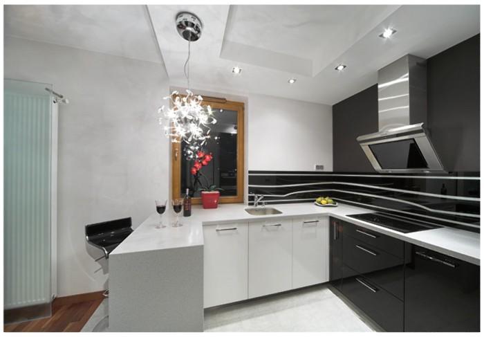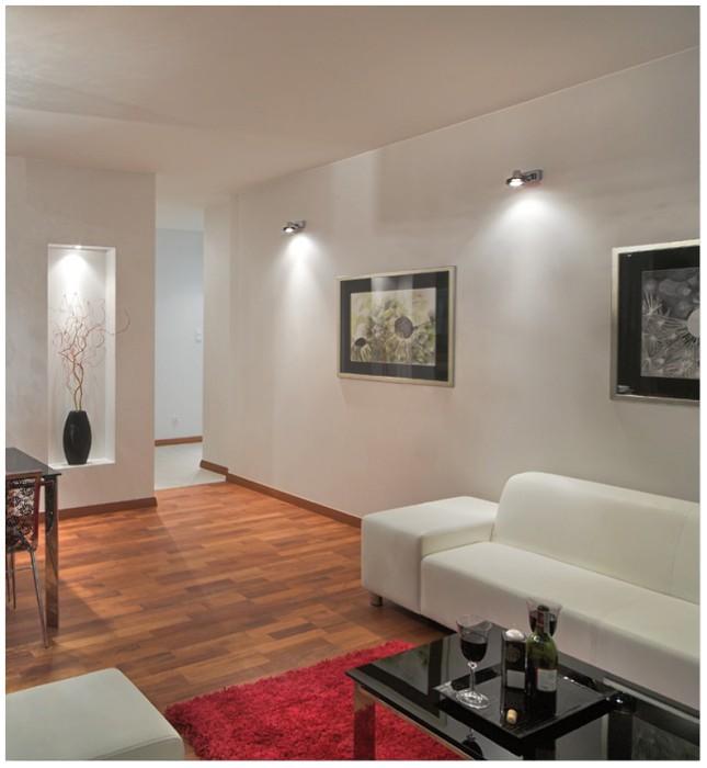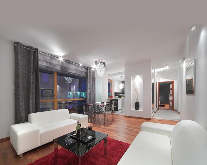 Niezmiernie ważnymi elementami, dzięki którym udało nam się osiągnąć zamierzone efekty, są w tym mieszkaniu konstrukcje kartonowo-gipsowe. Biała rama na tle czarnej tapety w salonie, konstrukcja pod sufitem w sypialni, podwieszane sufity w kuchni i łazience – to dzięki nim osiągnęliśmy dodatkowe efekty przestrzenne, to one pozwoliły nam na stworzenie kolejnych, niebanalnych scen świetlnych. Subtelnie wymykające się spod nich światło ledowe może być wyłączną aranżacją nastrojowego wieczoru lub tylko dodatkowym olśnieniem wśród reflektorów i kryształowych lamp. Wielopoziomowość światła nie tylko powiększa przestrzeń, ale przede wszystkim ją eksponuje.