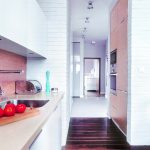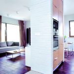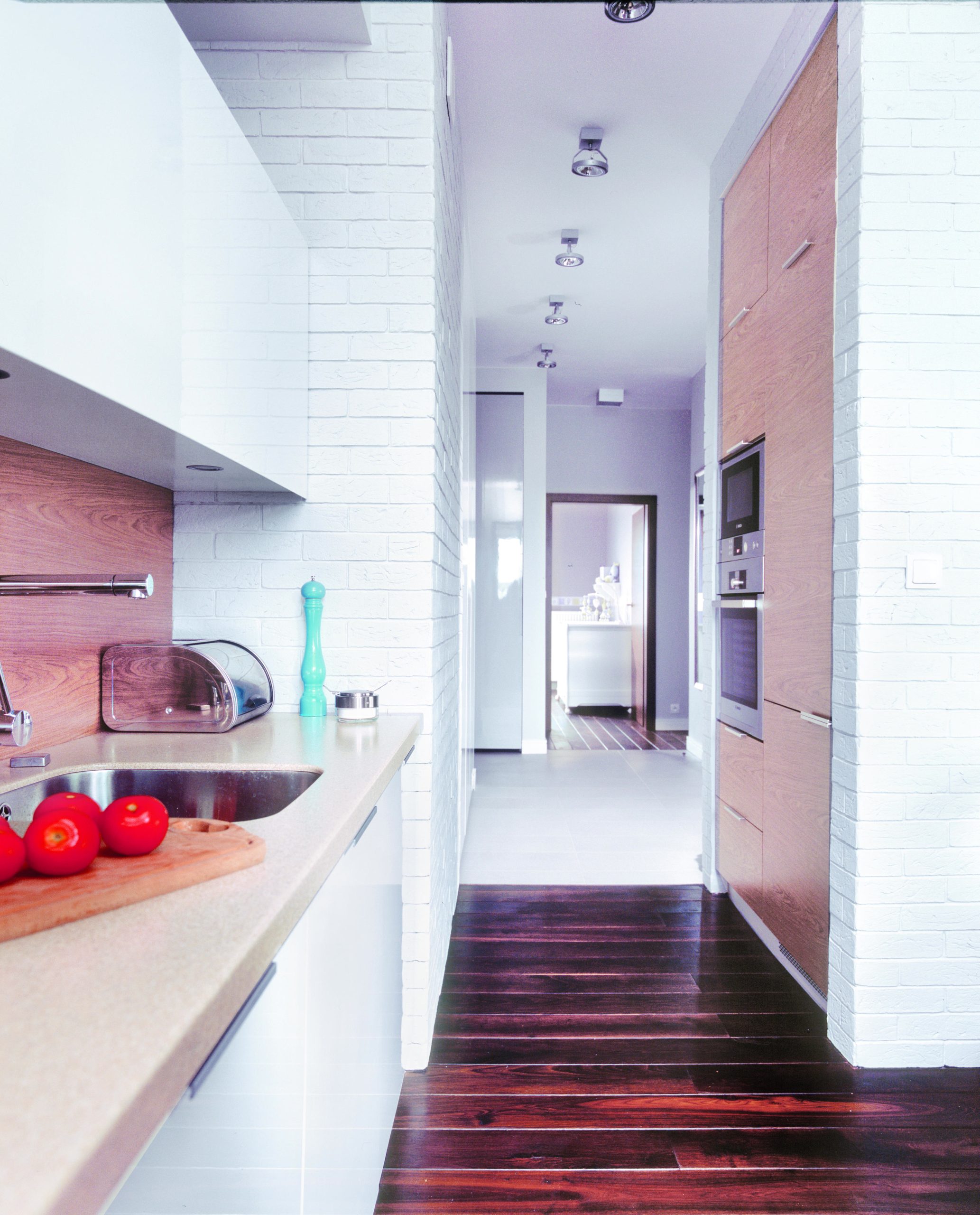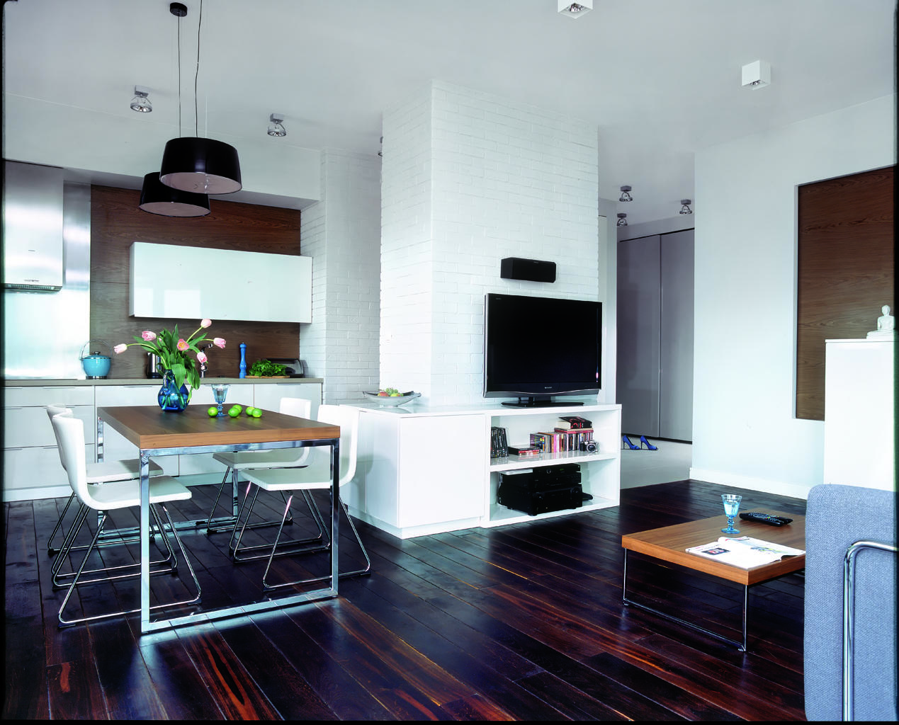 W momencie rozpoczęcia prac mieszkanie składało się z trzech pokoi, kuchni, łazienki, toalety, maleńkiej garderoby (została przerobiona na dwie odrębne szafy, dzięki czemu uzyskano większą przestrzeń do przechowywania) i przedpokoju. Mimo całkowitej powierzchni 85 m2 brakowało w nim wrażenia przestronności. Właściciele, małżeństwo z dzieckiem, potrzebowali sypialni, pokoju dziecięcego oraz salonu. Architekt i projektant wnętrz zaproponował wyburzenie ściany pomiędzy pokojem dziennym a kuchnią. Dzięki temu powstało jedno przestronne pomieszczenie o łącznej powierzchni 32 m2, łączące wiele funkcji: przygotowywania i wspólnego spożywania posiłków, odpoczynku i rozrywki oraz przyjmowania gości. Spójność stylu i kolorystyki zapewniły wspólne motywy forniru w kolorze orzecha zastosowane we: fragmencie ściany w kuchni, w osłonie ściennej przy barku w salonie oraz blacie stołu i stolika kawowego. Wysoka zabudowa kuchenna została ukryta we wnęce ściennej obłożonej ręcznie formowanymi ceramicznymi płytkami-cegiełkami pomalowanymi na biało. Od strony salonu, przy tej ścianie stoi telewizor. Ze względu na to, że główne pomieszczenie w mieszkaniu ma za zadanie łączyć wiele różnych funkcji, zastosowano w nim różne możliwości oświetlenia, które domownicy mogą wykorzystywać w zależności od swoich potrzeb. W kuchni zamontowano punktowe reflektorki oraz niewidoczne halogeny podszafkowe oświetlające blat roboczy. Ponadto umieszczono dwie lampy nad stołem jadalnym oraz delikatne oprawy stropowe (kostki), które korespondują z kolorem, na jaki został pomalowany sufit nad sofą i stolikiem kawowym. Poza tym, przy sofie znajduje się lampa stojąca, natomiast wąż świetlny ukryty w wyłożonej fornirem wnęce ściennej przy barku stanowi dodatkowe oświetlenie dekoracyjne.