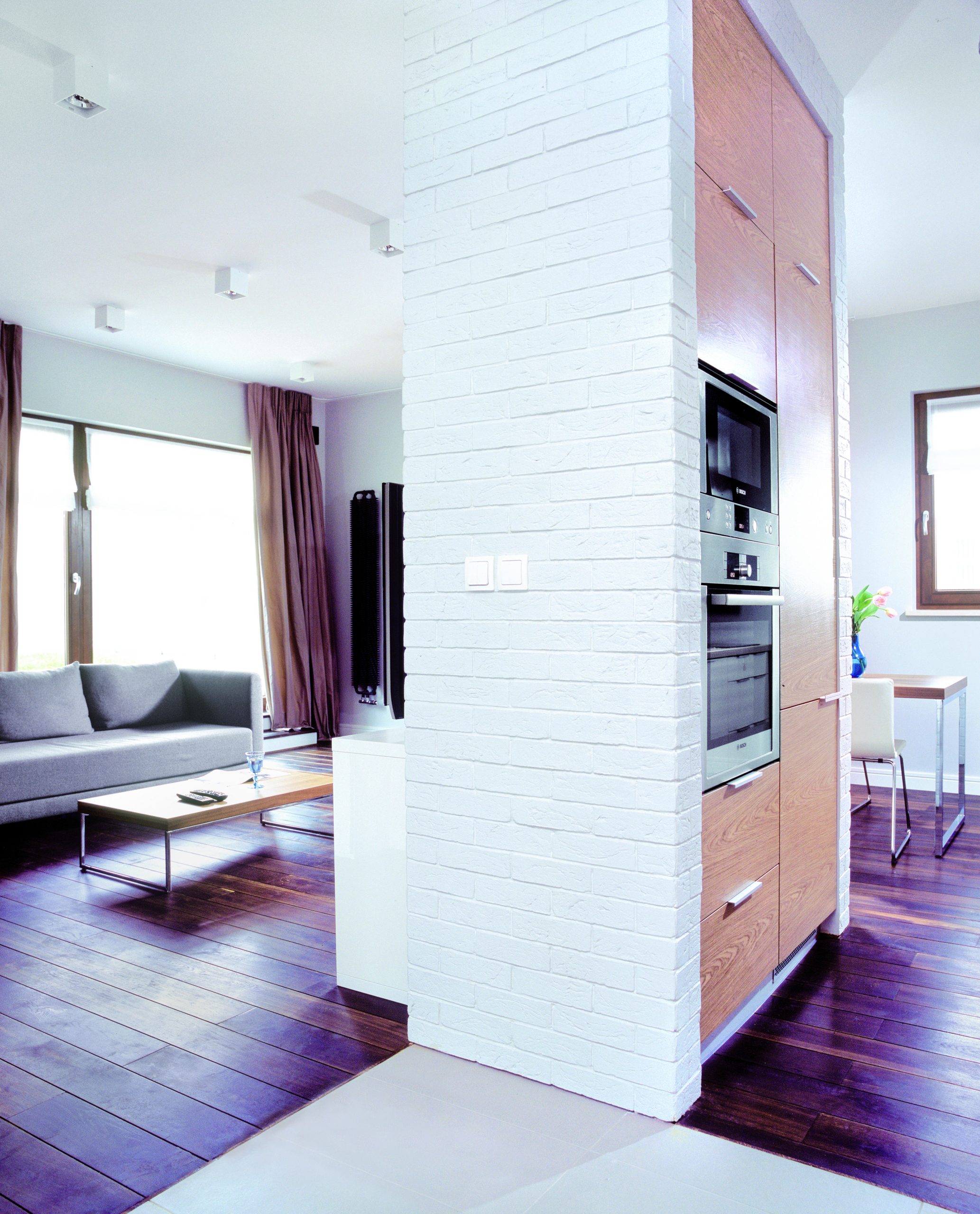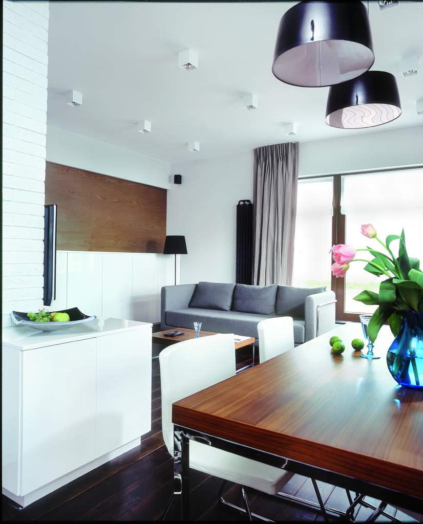 Właścicielom mieszkania zależało na tym, aby dom pełnił funkcję oazy spokoju, czyli zapewniał odpowiednie warunki do odpoczynku, wyciszenia i relaksu. Architekt uwzględnił te wskazówki w odpowiedni sposób dobierając kolorystykę ścian, mebli i dodatków. Szare zasłony w salonie zostały uszyte z tafty i doskonale komponują się z matową szarością sofy. Staranny dobór zastosowanych tkanin sprawia, że oba elementy idealnie do siebie pasują. Chłodny brąz orzecha zastosowany w fornirach oraz dąb wędzony, którym wyłożono podłogi, stanowią doskonałe dopełnienie wnętrza salonu. Dwa dekoracyjne grzejniki w czarnym kolorze wpisują się w spokojną atmosferę wnętrza. Lekkości pomieszczeniu dodają chromowane nóżki stołu, krzeseł, stolika oraz sofy. Ważnym elementem kompozycji przestrzeni jest biel. Poza pomalowanymi na biało cegiełkami, pojawia się ona na ścianach i suficie, jak również na frontach szafek kuchennych, szafki RTV oraz barku. Zabieg ten pozwolił nie tylko optycznie powiększyć przestrzeń najbardziej reprezentacyjnego pomieszczenia w mieszkaniu, ale także uspokoić kompozycję. To właśnie zastosowanie bieli jako koloru dominującego wpływa na „kojącą atmosferę” tego domu. Wprowadza ona do wnętrza porządek, wrażenie pełnej harmonii i równowagi. Przytulność pokoju dziennego podkreślają książki, płyty, elementy dekoracyjne i dodatki.