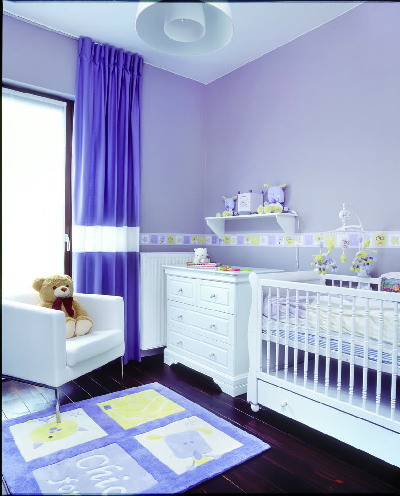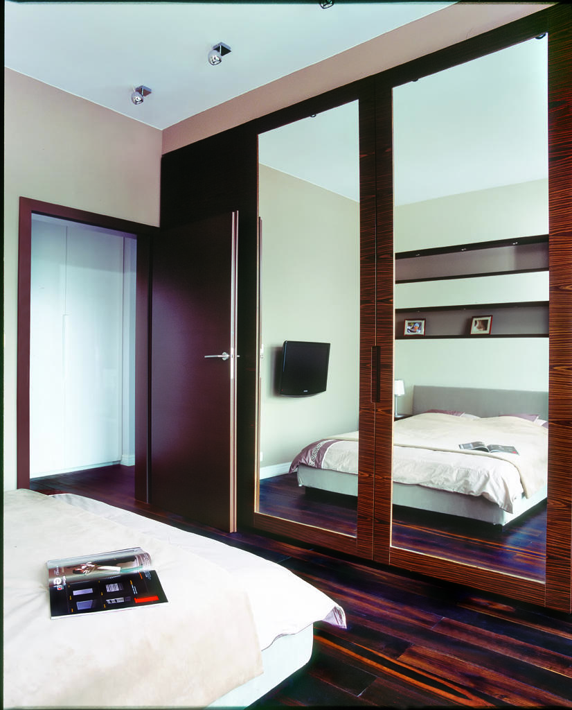 Sypialnia ma powierzchnię 17 m2. Mimo stosunkowo niewielkich rozmiarów pomieszczenia, gospodarzom zależało na tym, aby zmieściło się w nim nie tylko łóżko o szerokości 160 cm i nocne szafki, ale także duża i pojemna szafa z lustrami, telewizor oraz kącik do pracy. Biurko z komputerem przenośnym zostało oddzielone od reszty pomieszczenia parawanem, dzięki czemu jeden pokój z powodzeniem łączy różne funkcje. Lustrzane drzwi szafy optycznie powiększają sypialnię. Kompozycja wnętrza tego pomieszczenia jest spójna z całością mieszkania, przede wszystkim poprzez zastosowanie podłogi w kolorze dębu wędzonego, orzechowego koloru ścian i białego sufitu. Dla odmiany, pokój dziecięcy został utrzymany w delikatnym odcieniu fioletu połączonego z bielą. Fiolet to kolor dominujący na ścianach, zasłonach, motywach na dywanie i bordiurze ściennej. Meble w tym pomieszczeniu mają klasyczny kształt, co dodaje wnętrzu jeszcze większej przytulności. W pobliżu wejścia do pokoju dziecięcego, na korytarzu, umieszczono pojemną szafę wnękową.