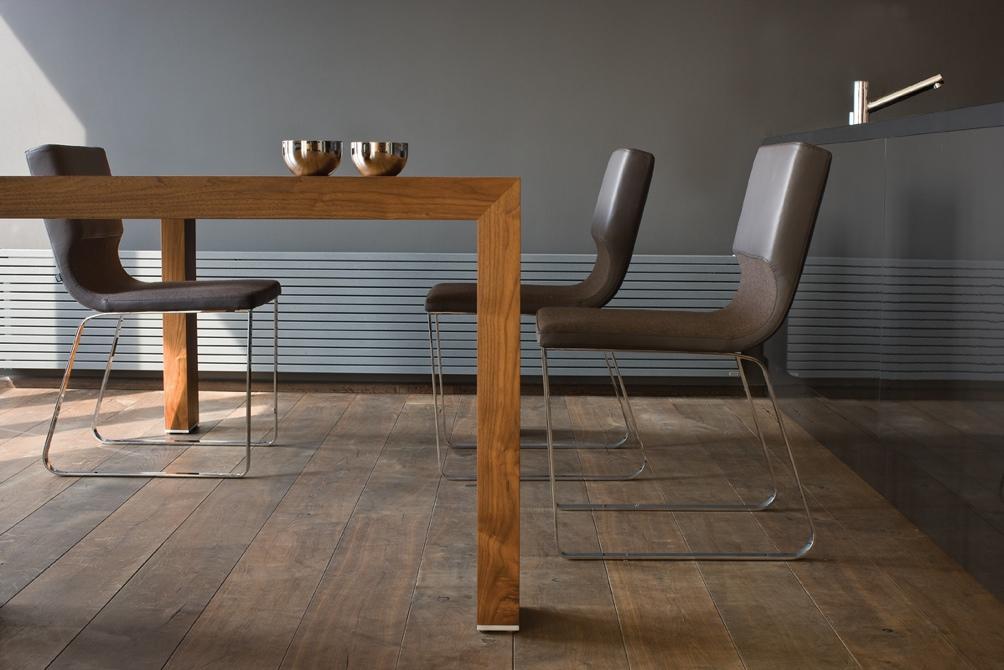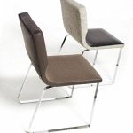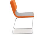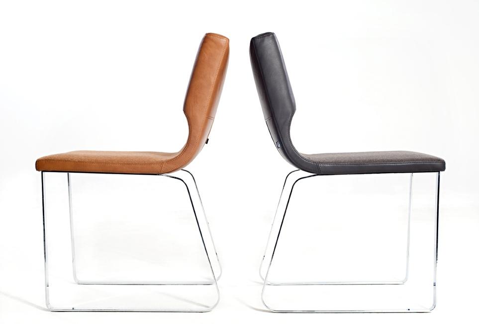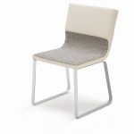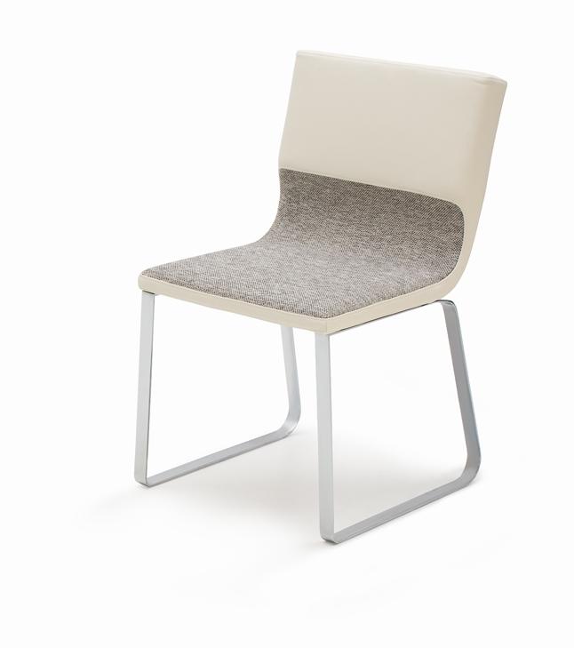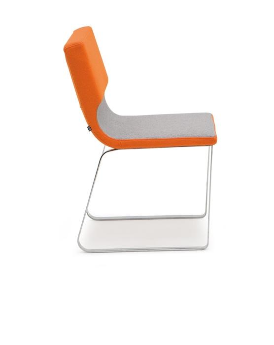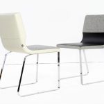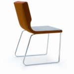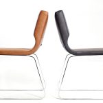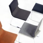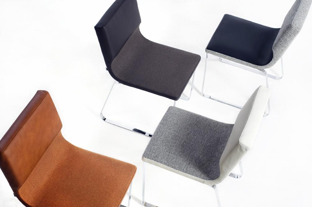 Krzesło tapicerowane nawiązujące profilem do przecinka, interpunkcyjnego znaku zatrzymania się na złapanie oddechu, w tym wypadku….przy stole.
