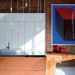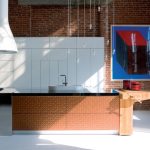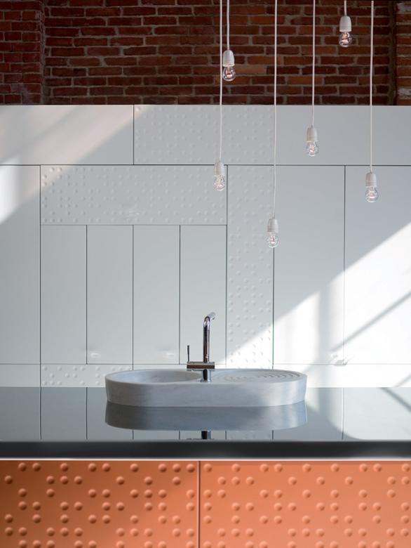 Materiały: ciepłe, dotykowe wykończenia, dekoracyjne wzory w postaci pozornie przypadkowych małych, okrągłych zagłębień, asymetryczne podziały tworzone przez moduły wysokiej zabudowy szaf. Elementy te wprowadzają poczucie ciepła, tworzą wrażenie przyjemnego „bałaganu” charakterystycznego dla kuchni, która żyje.