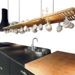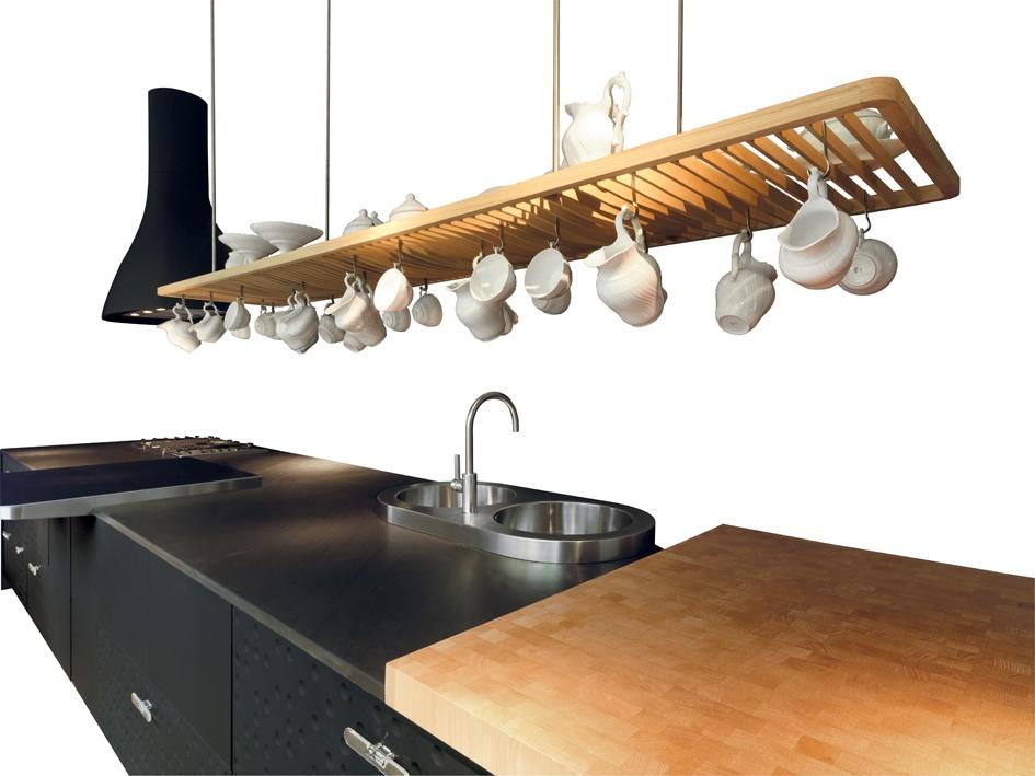 – nad wyspą wisząca drewniana kratownica do zawieszania naczyń i akcesoriów kuchennych,