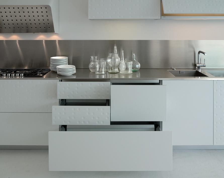 Funkcjonalność modelu Mesa jest oparta nie tylko na dobrze zaprojektowanym systemie małych i dużych szuflad, ale również na modułowych wysokich szafach z wbudowanym AGD. Moduły dostępne są w różnych rozmiarach z bogatym indywidualnie dobieranym wyposażeniem wewnętrznym. Wykończenie frontów szaf może być gładkie lub trójwymiarowe -okrągłe zagłębienia. Różne rozmiary poszczególnych modułów oraz różne wykończenia frontów pomagają łatwo odróżnić funkcje poszczególnych elementów – szaf, szuflad.