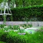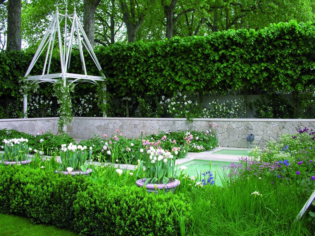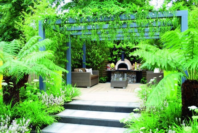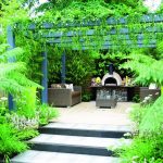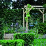 Ciekawym rozwiązaniem jest zastosowanie w ogrodzie pergoli obsadzonej zimozielonymi bylinami. Na zdjęciu widoczny jest barwinek pospolity posadzony na górnych żerdziach pergoli wraz z paprotkami. Białe kwiaty i długie pędy barwinka zwisają jak swobodnie puszczone pnącza. Dodatkowymi zaletami tej pergoli są prosta, nowoczesna konstrukcja oraz oryginalny kolor.