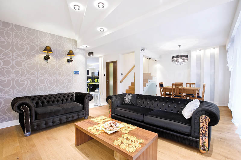Dom szeregowy w centrum dużego miasta okazał się wygodną i przytulną oazą dla czteroosobowej rodziny. Inwestorzy nie bali się ani odważnych rozwiązań przestrzennych, ani mocnych kolorów oraz kontrastowych zestawień form. Wnętrze miało być wyraziste a przy tym niebanalne, dlatego konieczne było znalezienie wspólnego mianownika dla piękna i wygody. Jak udało się to osiągnąć? Prostota została konsekwentnie przemieszana z przepychem. Dążenie do funkcjonalności pomieszczeń zagwarantowało komfortowy efekt a uzupełnienie całości elementami wyposażenia w stylu glamour zdecydowało o nietuzinkowej osobowości wnętrz. Ostre barwy i proste formy mebli, łagodzą miękkie, pikowane kanapy. Nowoczesne oświetlenie stropowe, wmontowane w ostro przecinające pomieszczenie linie sufitu podwieszanego, konkuruje z dumnie pyszniącą się nad stołem lampą i stylizowanymi kinkietami. Typową balustradę zastąpiły szklane, dyskretnie przytwierdzone do ścian panele, dzięki którym klatka schodowa jest bardzo jasna i wydaje się większa, niż jest w rzeczywistości.