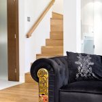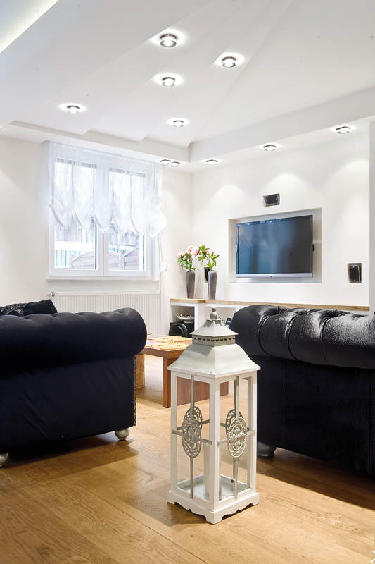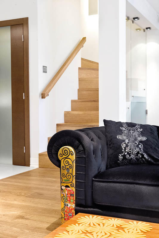Równie konsekwentny a zarazem przytulny okazał się dobór kolorystyki. Ciepły i spokojny odcień drewnianej podłogi i stolika kawowego oraz schodów neutralizuje aranżację, w której dominuje czerń. Chcąc wydobyć niezwykłą osobowość wnętrz, położono również nacisk na efekty światłocieniowe. W tej roli niezwykle wytwornie sprawdziła się ściana z pionowymi skośnymi filarami, między które zostało wprawione lakierowane szkło, pięknie odbijające światło i tworzące efekt głębi.