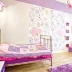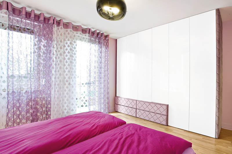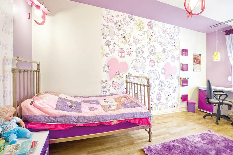 Pokój córeczki kojarzy się z beztroską i swobodą pobudzającą do kreatywnego działania. W tym wnętrzu również nie zabrakło nietuzinkowych rozwiązań. Modne wydruki wielkoformatowe mogą mieć różny charakter. Najczęściej są zdjęciem, dużym dominującym elementem. Tym razem wręcz przeciwnie – przybrały formę dziecięcej tapety w pastelowych odcieniach. W efekcie radosne, kolorowe zwierzaki w towarzystwie różnobarwnych lampionów, puszystego dywanika, półek na mnóstwo zabawek, książeczek, rysunków i klasyczne łóżko, rodem z baśni, wywołuje tęsknotę za krainą dzieciństwa.