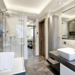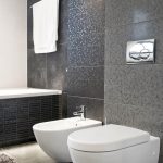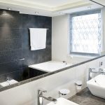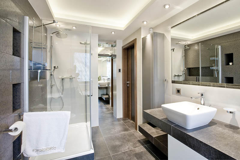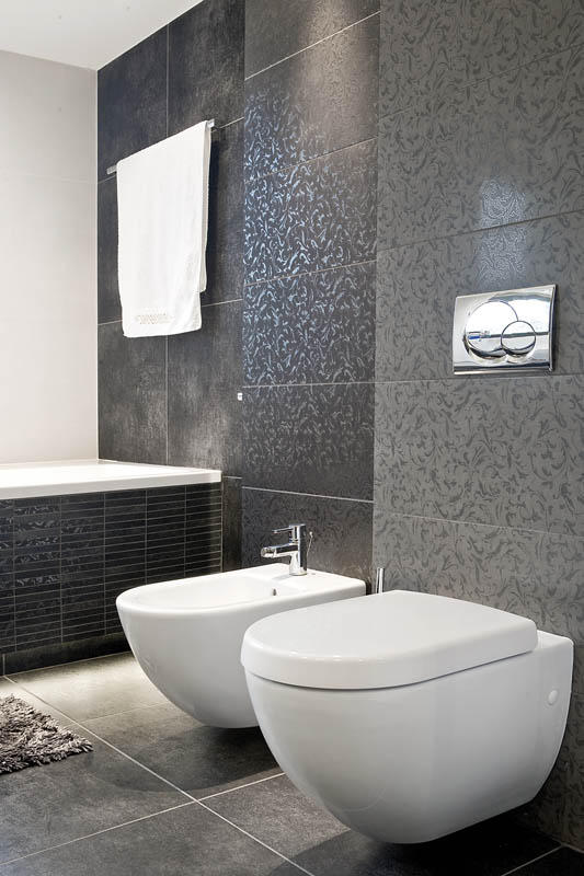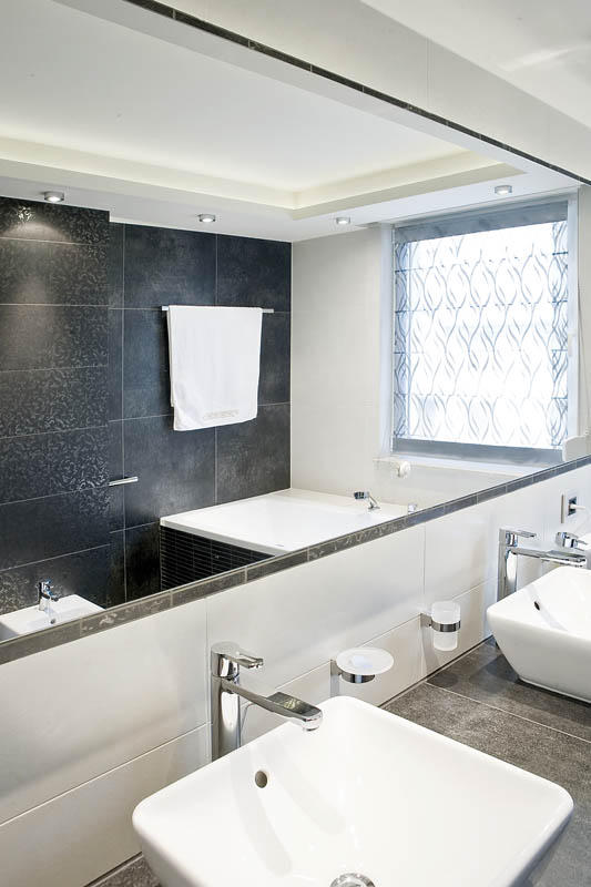 Długa i dość wąska łazienka pomieściła w sobie wszystko, co było niezbędne do wygodnego funkcjonowania zarówno dorosłych, jak i młodszych domowników. Kolorystyka łazienki nawiązuje do koncepcji parteru. Tym razem wysoki połysk mebli zastąpił efekt metalizacji powierzchni. Ogromny dwupiętrowy blat pod umywalką pozwala swobodnie rozłożyć podręczne sprzęty i kosmetyki całej czwórki. Nad blatem wisi ogromne, podświetlone wzdłuż wszystkich krawędzi lustro, które koresponduje ze światłem, zarówno naturalnym, jak i sztucznym, jednocześnie optycznie poszerzając pomieszczenie. Ponadto odbija się w nim subtelna a zarazem niesłychanie dekoracyjna ściana pokryta gąszczem maleńkich kwiatków.