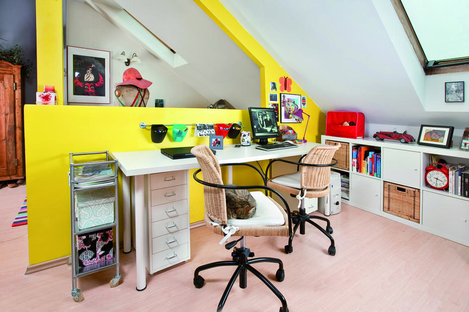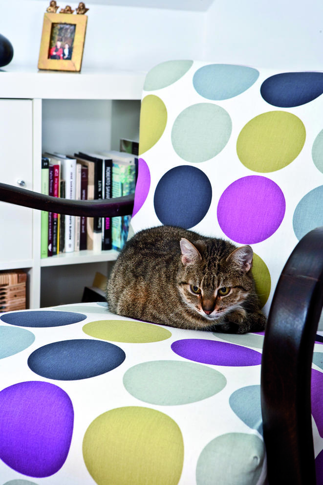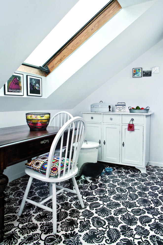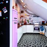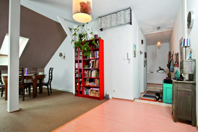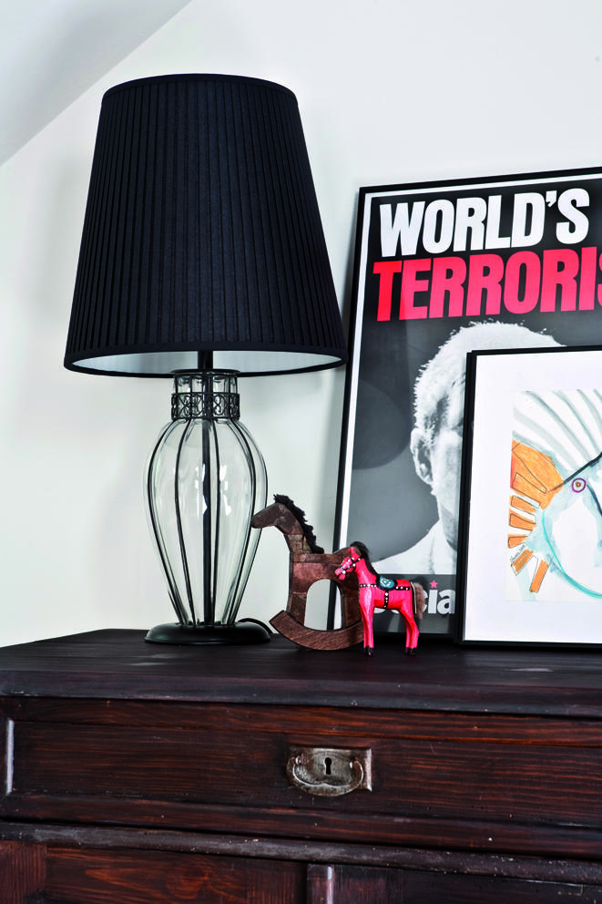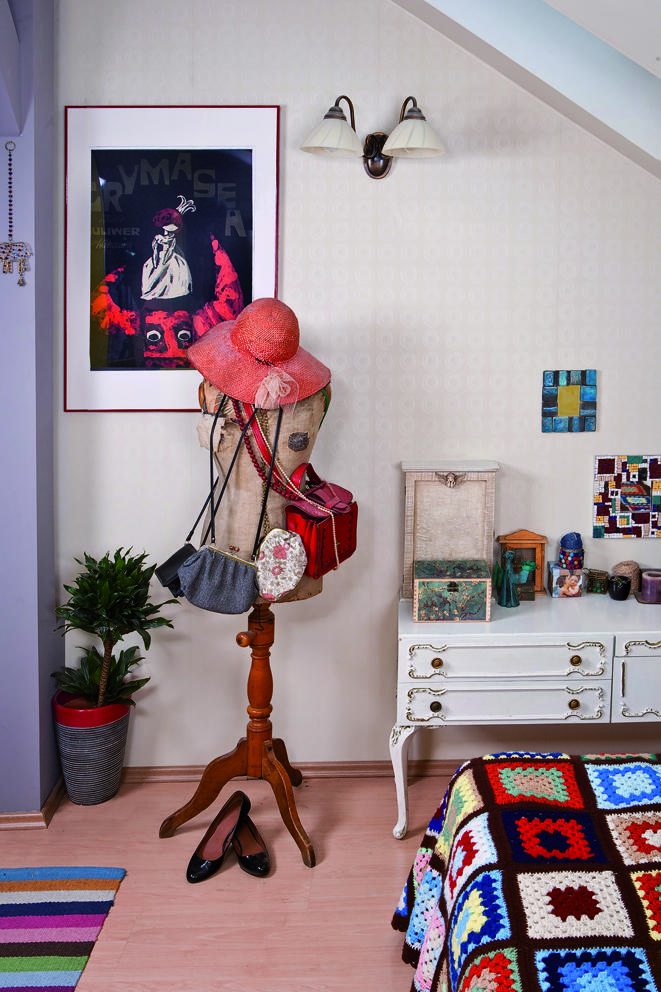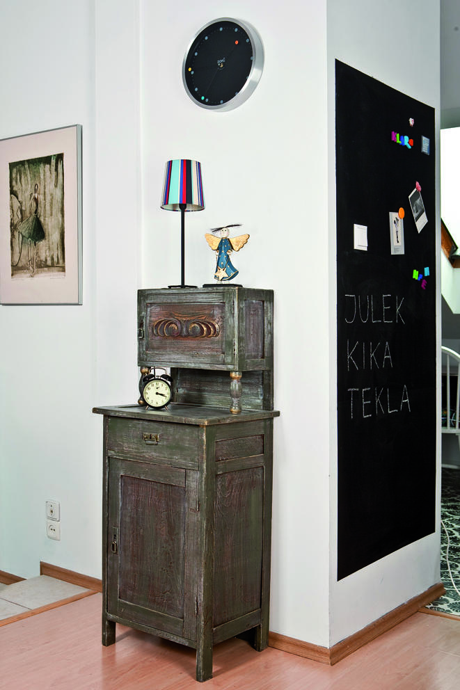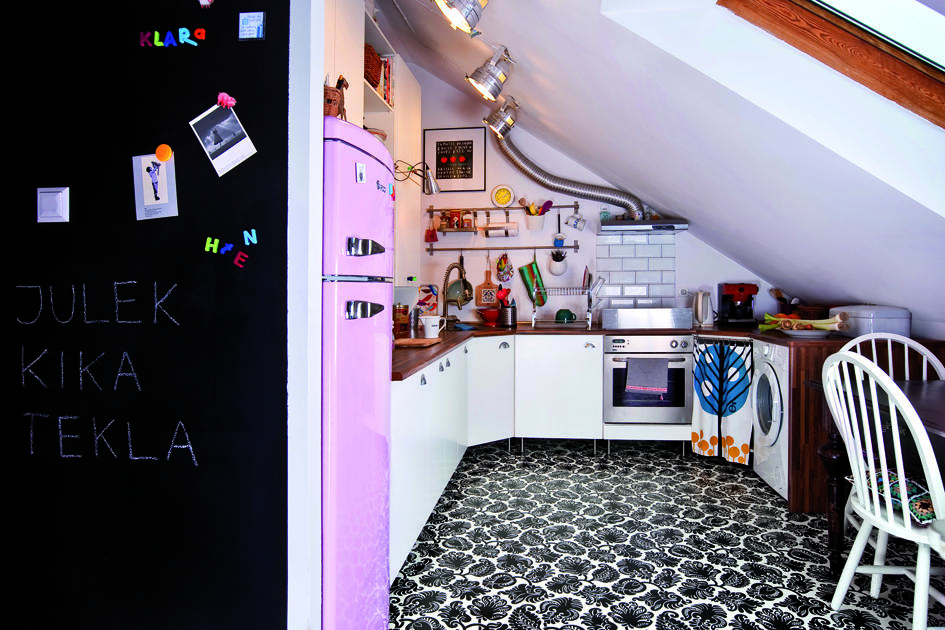 To nie był zwykły remont. To było usunięcie wszystkiego co do tej pory znajdowało się na poddaszu. Pozostawiono jedynie podłogę, która i tak będzie wymieniona przy okazji kolejnego remontu, na jasne drewniane deski. Zamknięty w sobie „świat szuflad i pawlaczy” w jednej chwili stał się otwartą, jasną przestrzenią, która z dnia na dzień zaczęła nabierać kształtów i kolorów. Maja, jako główna sprawczyni całego zamieszania, od razu miała wizję wyglądu swoich czterech ścian. Styl w jakim poczuła się jak ryba w wodzie to vintage, który w konsekwencji zakradł się do każdego najmniejszego zakamarka jej poddasza. Ogrom rzeczy, które znajdują się we wnętrzu sprawia, że już na pierwszy rzut oka wydaje się ono bardzo dynamiczne. Większość z nich znajduje się na tle białych i jasnych ścian. Maja zastosowała ten zabieg, ponieważ chciała wyeksponować charakterystyczne kształty i barwy poszczególnych mebli oraz dodatków. Wszechobecna biel stała się idealnym tłem do zabawy kolorem. W każdym kącie znajduje się wyjątkowy przedmiot, który buduje niesamowity klimat, emanując spośród innych swoją wyrazistością: turkusowa ława w przedpokoju, czerwony regał w pokoju dziennym, różowa lodówka w kuchni, a także „król gabinetu” fotel w wielkie, kolorowe grochy. Maja w swoim powrocie do przeszłości nie boi się awangardowych zestawień, fantazyjnych form i starych detali. Najbardziej uwidacznia się to w kuchni, gdzie panuje istne vintage’owe szaleństwo. Maja zadbała tutaj o każdy szczegół – kubki, talerze, waga kuchenna, a nawet durszlak są jakby minutę temu zabrane ze stołu gospodyni z lat 60-tych. To wszystko jest przyprawione wręcz przemysłowymi lampami oraz charakterystyczną rurą okapową, które wprowadzają lekko industrialny klimat, natomiast różowa lodówka dodaje szczyptę pop-artowskiego smaku. Wszystko razem tworzy niezmiernie ciekawą całość, która sprawia, że „pichcenie” w takiej kuchni to prawdziwa przyjemność! Maja wręcz nie znosi kompletów, uważa że indywidualizm poszczególnych elementów sprawia, że mieszkanie wydaje się o wiele barwniejsze i ciekawsze. Jedyną skompletowaną rzeczą są krzesła w salonie, natomiast każdy pozostały przedmiot ma swoją odrębną historię i miejsce pochodzenia. Wszystkie elementy wyposażenia są tak dobrane, aby bez trudu mogły nagle zmienić swoją lokalizację, a czasami nawet kolor, dzięki czemu wrażenie nudy jest obce domownikom. Pomysły na nowe konfiguracje akcesoriów i kolorów powstają w głowie Mai w błyskawicznym tempie. Nawet w trakcie naszej kilkugodzinnej rozmowy Maja nagle doszła do wniosku, że musi zmienić kolor jednej szafki z brązowego na żółty, „bo przecież tak lepiej pasuje…”. Gadżety, które Maja zdołała nagromadzić często zahaczają o granicę kiczu, jednak udało jej się w tak perfekcyjny sposób uchwycić proporcje konstrukcyjne zarówno mebli, jak i innych pozostałych drobiazgów, że całość domaga się bezwarunkowego zachwytu!