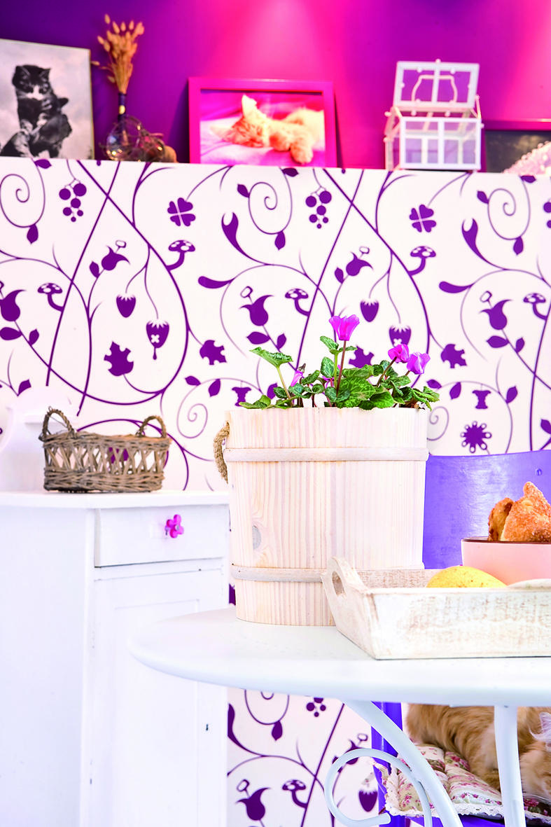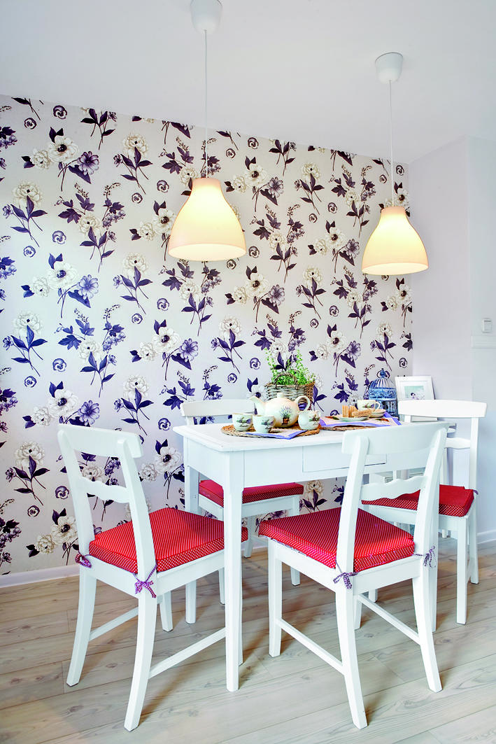 Motywy floralne pojawiają się praktycznie w każdym zakamarku wnętrza – na ścianach, meblach, dekoracjach. Użyte z ogromną konsekwencją pozwalają uniknąć wrażenia przesytu i budują przytulny klimat poddasza.