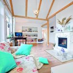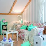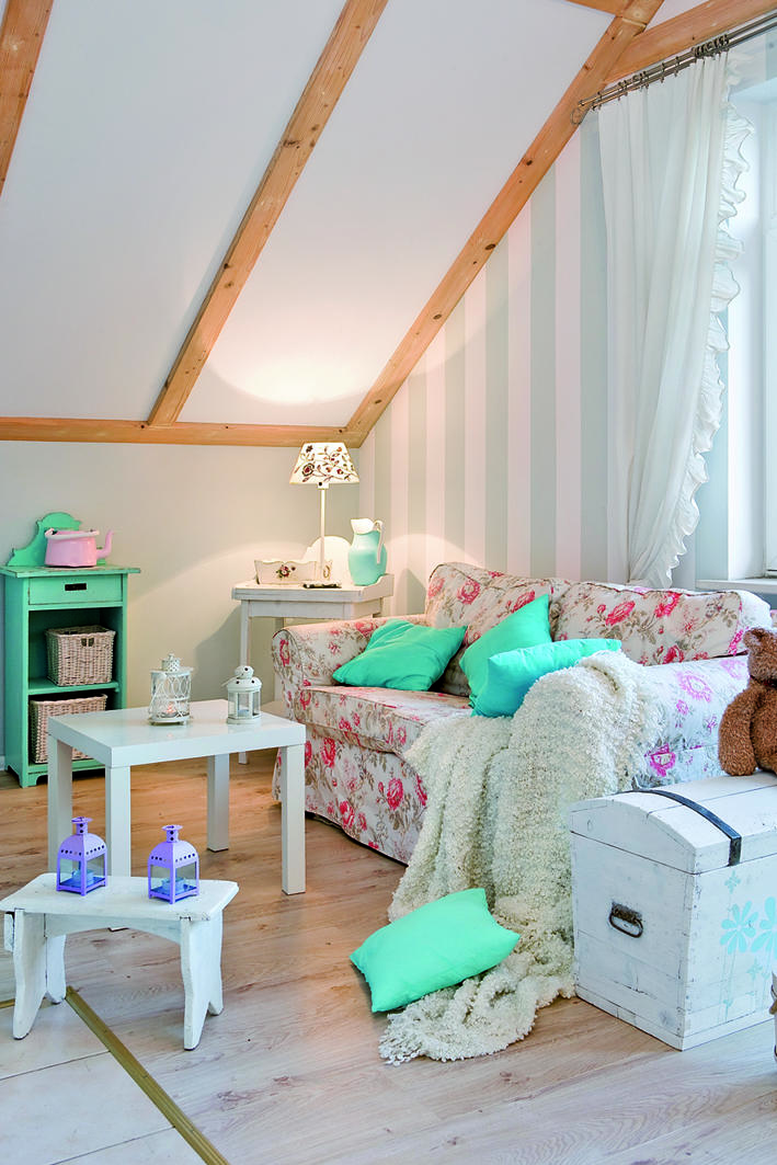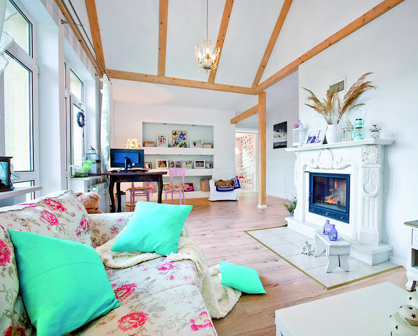 Pani domu inspiracje do urządzania wnętrz znalazła podczas pobytu w Irlandii. Uwielbiała odwiedzać miejscowe sklepiki z elementami wyposażenia i snuć marzenia o swoim domu. Zachwycały ją mnóstwem ciekawych dodatków i same w sobie wyglądały jak miejsca, w których „prawie można byłoby zamieszkać”. Po powrocie do kraju Pani Agnieszka skrupulatnie podeszła do realizacji marzeń. Główny nacisk położyła na detale, które zdecydowały o magii tego pastelowego poddasza o „antyminimalistycznej” osobowości. Zgodnie z wyznacznikami stylu motywem przewodnim są kwiaty, które pojawiają na obiciach mebli, tapetach, porcelanie, naczyniach a nawet obrazach. Nie brakuje również fotografii, które przywołują sielskie wspomnienia. Wygodne, tapicerowane sofy i fotele dopełniają miękkie poduchy i narzuty. Jak przystało na styl angielski szacunek dla tradycji idzie tu w parze z dążeniem do wygody w pełnej harmonii z otoczeniem. Większość mebli, które znalazły tutaj swoje zastosowanie to stare przedmioty, które stanowiły kiedyś wyposażenie tego wnętrza. Pani Agnieszka twierdzi nawet, że „kilka z tych przedmiotów na pewno kryje w sobie jakąś nieznaną historię…” Wiele krzeseł, stoliki czy komódki zostały odmalowane, aby pasowały do klimatu wnętrza.