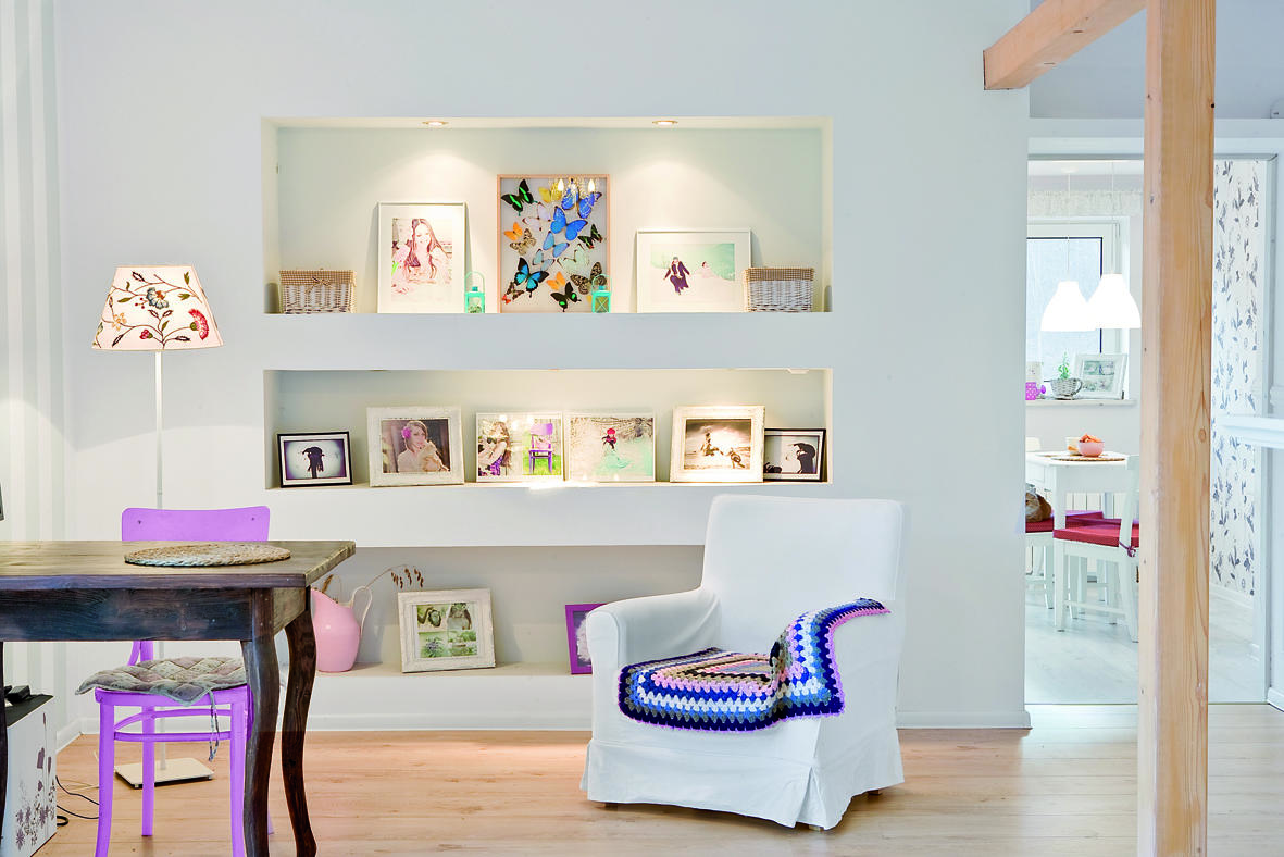 Meble, tkaniny a także dekoracje wzajemnie się uzupełniają i konsekwentnie korespondują ze sobą. W każdym pomieszczeniu są nieco inne, ale mają wspólny mianownik w postaci podobnej palety barw. Pani Agnieszce zależało głównie na tym, aby „mieszkanie było inne niż typowe polskie wnętrza utrzymane w kolorystyce żółci, pomarańczy czy zieleni”. Jak wspomina w kwestii doboru odcieni „główną inspirację stanowiły skandynawskie wnętrza w chłodnych, stonowanych kolorach, które mimo wszystko miały w sobie dużo ciepła”. Pomimo tak skonkretyzowanych upodobań uzyskanie spójnej gamy kolorystycznej wcale nie było takie proste, bo to kobiety mają świadomość tonalnych niuansów barw a męska percepcja odcieni zakłada występowanie głównie kolorów podstawowych.