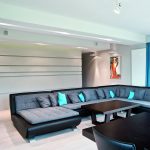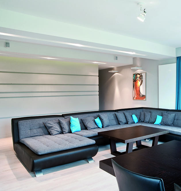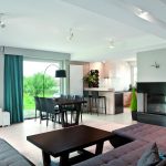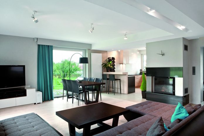 Układ przestrzeni został podzielony na dwie strefy dzienną oraz prywatną. Przestronny salon o powierzchni 50 m2 wraz z częścią jadalnianą to strefa, w której toczy się życie. Zważywszy na otwartość gospodarzy, dom zawsze jest pełen gości. Przestronna sofa usytuowana w centralnej części salonu to miejsce, gdzie odpoczynek trwa wiecznie. Szczególnie po degustacji kulinarnych eksperymentów gospodarza. Za sofą ściana z poziomych modułów oddziela część otwartą od reszty domu.