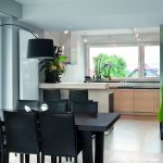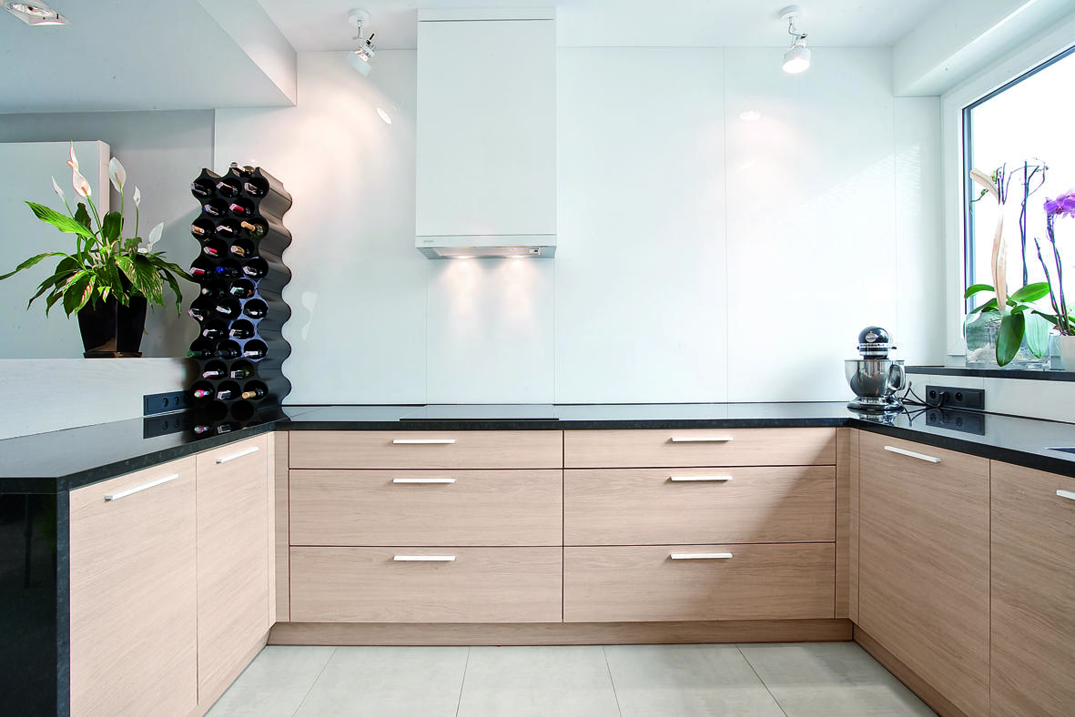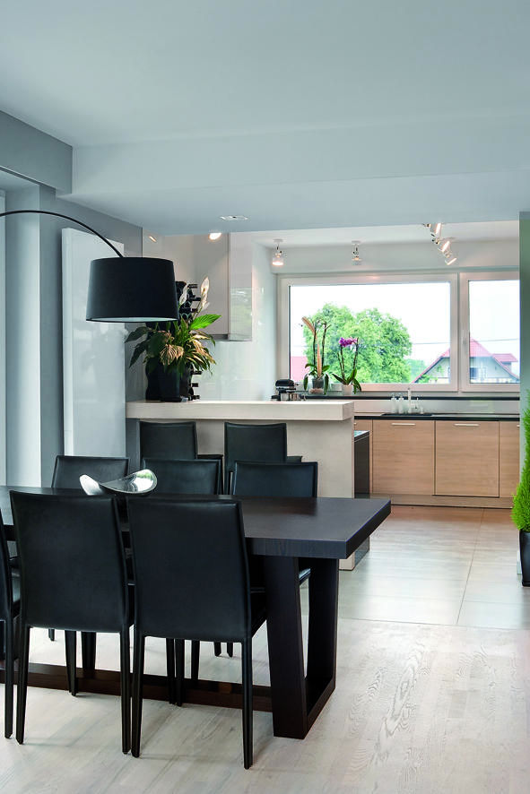 Kuchnia to otwarta część przysłonięta zabudową wysokiego stołu barowego. Zastosowane materiały to fornir dębowy bielony połączony z granitem nero Zimbabwe, z którego wykonano duże powierzchnie blatu roboczego. Ściany na całej płaszczyźnie kuchni pokryto szkłem lakierowanym w odcieniu czystej bieli.