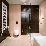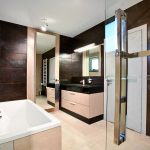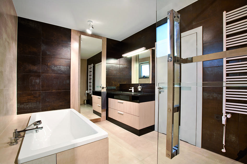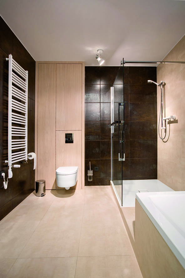 Łazienka w części prywatnej to połączenie gresów w odcieniu ciepłego brązu mieniącego się odcieniami metalu oraz kremowej płytki z wzorem zastygłego cementu. Podest wyraźnie wyznacza strefę kąpielową. W tej części zostały usytuowane stalowa wanna Conduo oraz brodzik Conoflat. Zabudowy meblowe w jasnym dębie nawiązują do odcienia płytki podłogowej. Szafa z misą toaletową to niezwykle praktyczny patent na ukrycie niezbędnych akcesoriów.