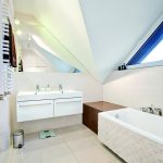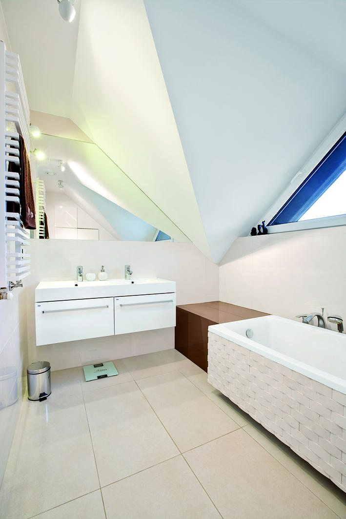 Na poddaszu mieści się część prywatna domowników. Niewielka łazienka ze znacznymi skosami oraz nietypowym oknem. Podwieszona wanna z kamiennym frontem łączy się z ciemną zabudową biegnącą na całej szerokości łazienki.
