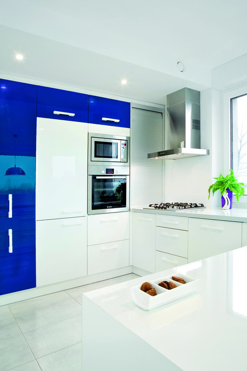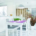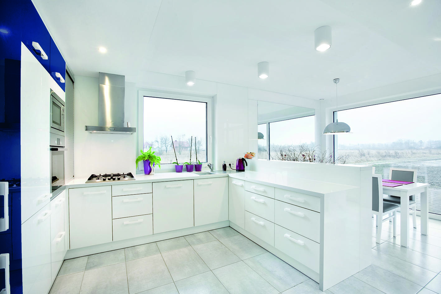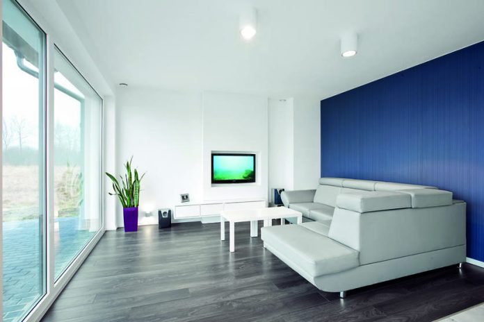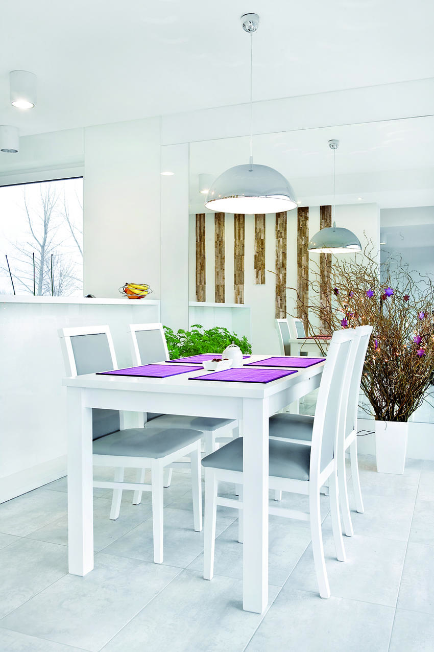 Założenia projektowe zostały osiągnięte dzięki zastosowaniu bieli jako motywu przewodniego. Priorytetem było stworzenie atmosfery inspirującej do wypoczynku po całym dniu pracy. Dom o niewielkiej powierzchni 120 m2 mieści część dzienną na poziomie zero oraz część sypialnianą na poddaszu. Energooszczędne rozwiązania są pasją i główną profesją właścicieli, dlatego też zostały tu zastosowane wszelkie innowacje – system rekuperacji, pomp ciepła czy baterie słoneczne. Integralną częścią strefy dziennej jest przeszklona ściana na rozpiętości salonu oraz jadalni. Dzięki tak dużemu naświetleniu wszechogarniająca biel jest podwójnie intensywna. Wysoka ściana z kamiennym akcentem tworzy formę parawanu dzielącego salon od części jadalno-kuchennej. Dyskretnym dopełnieniem monochromatycznych odcieni jest kolor głębokiego granatu. Pojawia się on na winylowej okładzinie ściennej w salonie oraz na frontach kuchennych. Elementy tapicerowane to ekoskóra w kolorze delikatnej szarości.