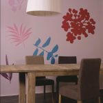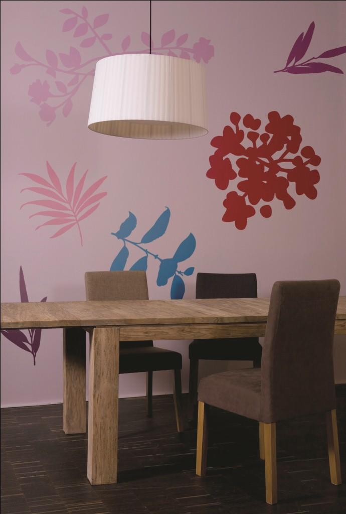 Wymalowane z użyciem szablonów duże aplikacje nadają pomieszczeniu oryginalny charakter. Warto je zróżnicować kolorystycznie (zwłaszcza, gdy elementy wyposażenia wnętrza pozostają w stonowanych kolorach) – najlepiej jednak poruszać się w obrębie palety zbliżonych barw, by uniknąć aranżacyjnego chaosu. Inspirowane kształtem liści ścienne dekoracje wprowadzają do wnętrza ożywczy powiew, doskonale przełamując surowość drewnianego stołu. Całość pozostaje w naturalnym, a przy tym nowoczesnym stylu.