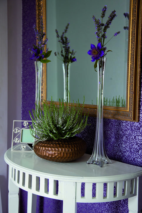 Niewielkich rozmiarów hol, lawendowo – kwiatowym szlakiem wiedzie do dalszej części domu. Konsekwencja z jaką zostało urządzone to wnętrze sprawia, że przedmioty, które się w nim znajdują, sprawiają wrażenie jakby były tu od zawsze.