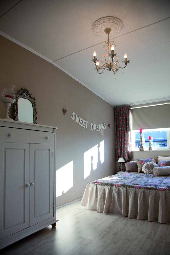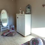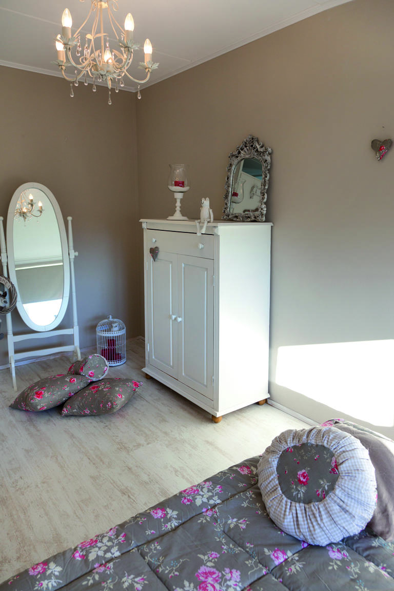 Przedpokój to miejsce, które jako pierwsze przeżyło metamorfozę. Niespełna tydzień po przeprowadzce był już pomalowany na ulubiony kolor Pani Maryli, czyli fioletowy. Inspiracją do stworzenia koncepcji korytarza była „koronkowa” tapeta znaleziona w jednym z amsterdamskich sklepów. Z kolei szablon z motywem florystycznym przywieziony z Polski zdecydował o przełamaniu wyrazistej barwy holu bielą. Później przyszła kolej na sypialnię dla gości, i tym razem pomysłów również nie brakowało, wręcz przeciwnie trudno było się zdecydować na jeden koncept. Rozwiązaniem stał się prezent urodzinowy, który Pani Maryla otrzymała od mamy ukochanego – w postaci pięknej narzuty z poduszkami i zasłonami. Pani Maryla od razu wiedziała, że to miejsce spełni jej pragnienia o stylu vintage, wspomnieniem jej marzeń z dzieciństwa.