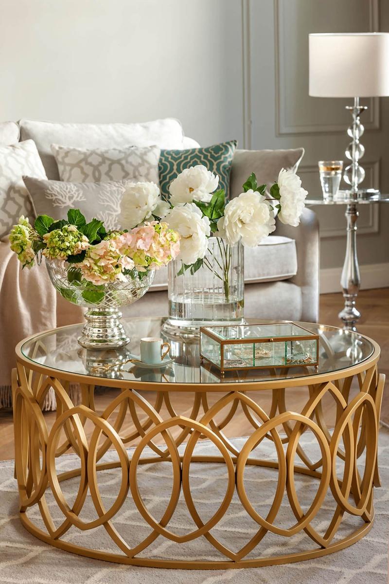 Styl glamour nieodzownie kojarzy się ze złotem. Dlatego nie mogło zabraknąć go również w jego amerykańskiej interpretacji. American glamour nie lubi jednak przesady, dlatego złoto obecne jest najczęściej w postaci subtelnych akcentów na szlachetnym materiale. W amerykańskim apartamencie wszystko powinno emanować łagodnym blaskiem. Jednak błysk to nie tylko złoto. Kolejnym elementem charakterystycznym dla tego stylu są kryształy, które przywodzą na myśl stylistykę art déco. W amerykańskich wnętrzach kryształowe są nie tylko dekoracyjne naczynia, ale również lustra, blaty stołów, a nawet całe meble. Ważną rolę odgrywa również szkło, używane zwłaszcza w oświetleniu.