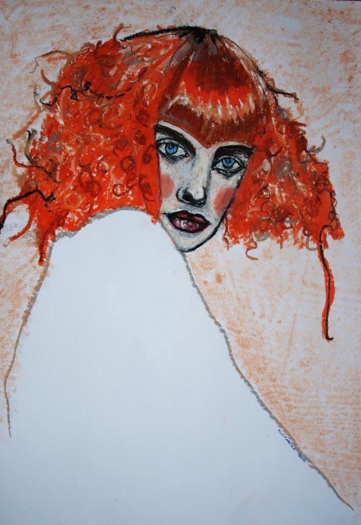 Dzieło skupione wokół jednej dominanty – płomiennych loków tytułowej kobiety w piżamie. Odważna kreska, swoiste rozedrganie to znaki rozpoznawcze artystki, która stawia na żywe kolory i pozornie chaotyczny charakter, które składają się na piękne surrealistyczne dzieła. Jak sama mówi, bez malarstwa i rysunku byłaby goła, pusta i szara. A maluje i rysuje wszystkim, co zostawia ślad.
