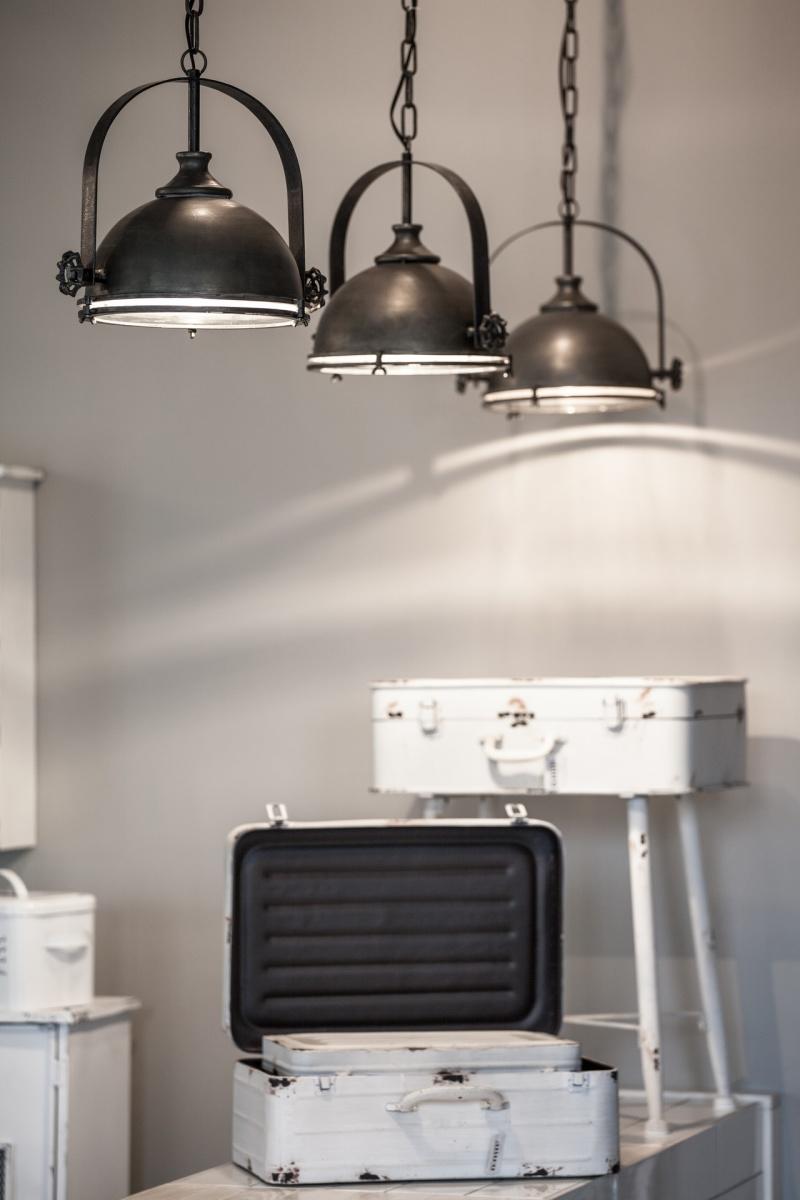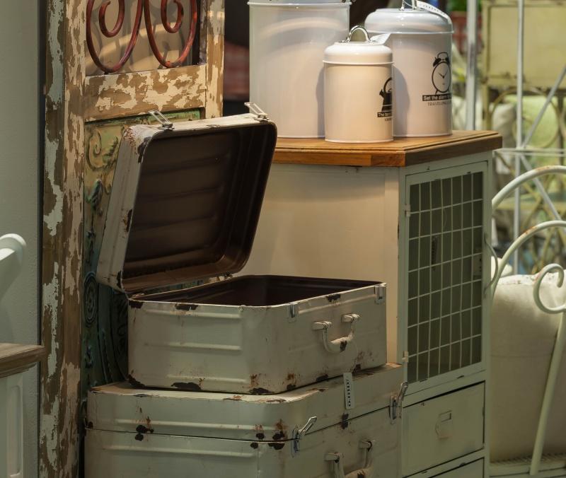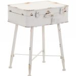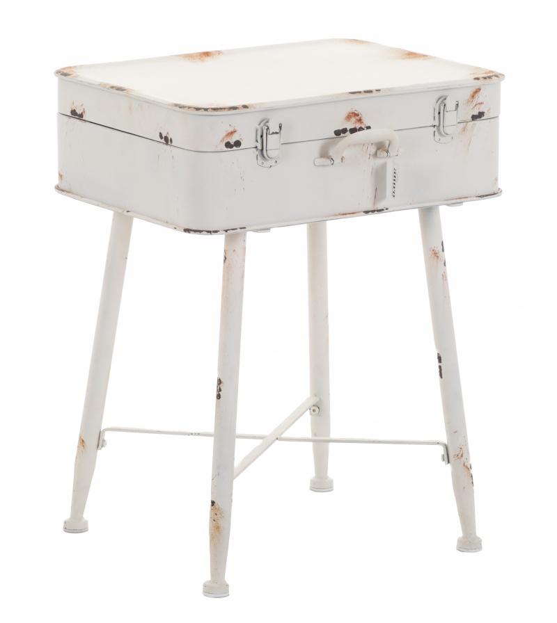 Materiał: metal w odcieniach bieli z widocznym, celowym efektem postarzenia i rdzewienia. Walizka jest otwierana.