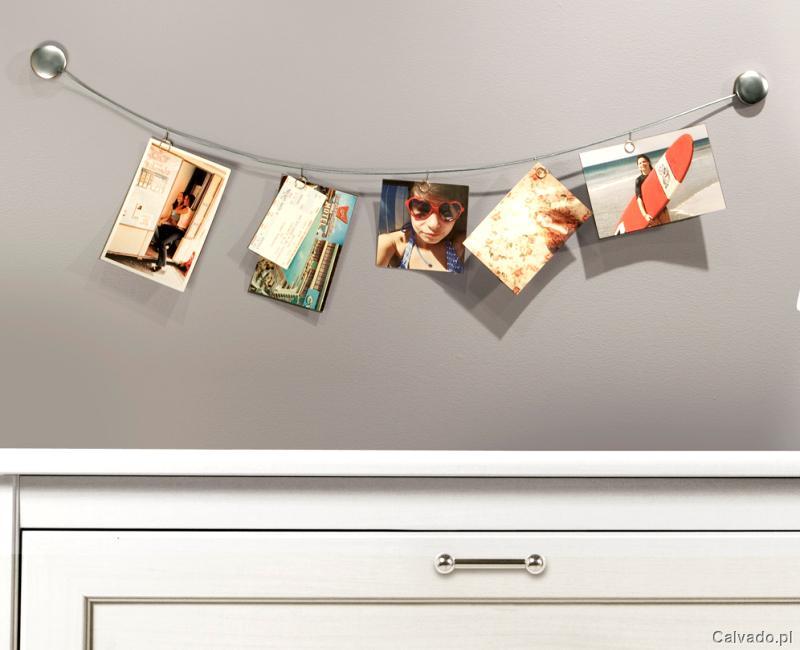 Oryginalny ścienny wieszak na zdjęcia i wiadomości w postaci linki z 5 zaczepami. Elegancki, nowoczesny charakter instalacji sprawia, że doskonale będzie się prezentować w wielu pomieszczeniach, zarówno jako ramka na zdjęcia w sypialni czy salonie jak i organizer na wiadomości w kuchni czy przedpokoju.
