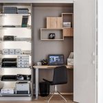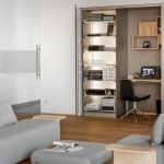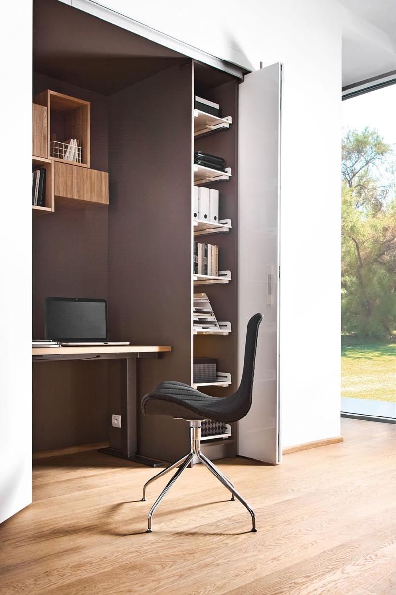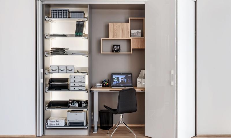 Odpowiednia aranżacja dowolnego pokoju, który pełni rolę salonu czy sypialni oraz wykorzystanie właściwego systemu drzwi i półek umożliwia stworzenie przestrzeni biurowej, którą możemy w dowolnym momencie schować za drzwiami.
