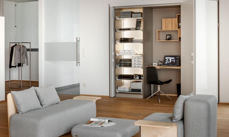 Ideą ukrytego biura jest, że gabinet wraz z biurkiem, szafkami oraz wyposażeniem ukryty jest w szafie wnękowej. W czasie, kiedy nie pracujemy, pomieszczenie z powodzeniem pełni rolę reprezentacyjnego salonu, przytulnej sypialni czy nawet kuchni. W godzinach aktywności zawodowej staje się on pełnowartościowym gabinetem. Jest to możliwe za sprawą nowatorskiego zastosowania w systemie HAWA-Folding Concepta rozsuwanych i składanych skrzydeł drzwiowych, które następnie w całości chowają się we wnęce. Otwarte drzwi dzięki temu w ogóle nie zajmują miejsca, a przez to nie zabierają powierzchni nawet wyjątkowo małego pokoju.