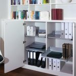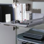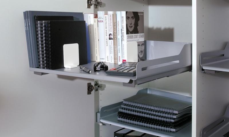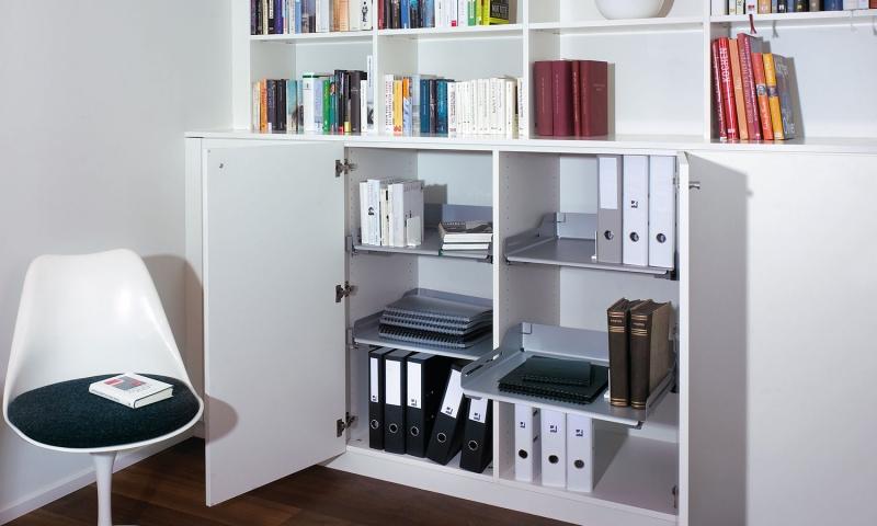 Podstawą tak rozwiązanej przestrzeni biurowej będą półki EXTENDO, które można wysuwać. Bez problemów pomieszczą obszerne segregatory na dokumenty, a dostęp do nich będzie ułatwiony. Kosze wykonane są z profilowanej blachy w taki sposób, aby zawartość półek nie wypadała podczas ich wysuwania. Dodatkowo zabezpieczone są matami antypoślizgowymi. Ponieważ mogą utrzymać ciężar do 30 kg można na nich postawić nawet niezbyt ciężką drukarkę czy inne urządzenia biurowe.