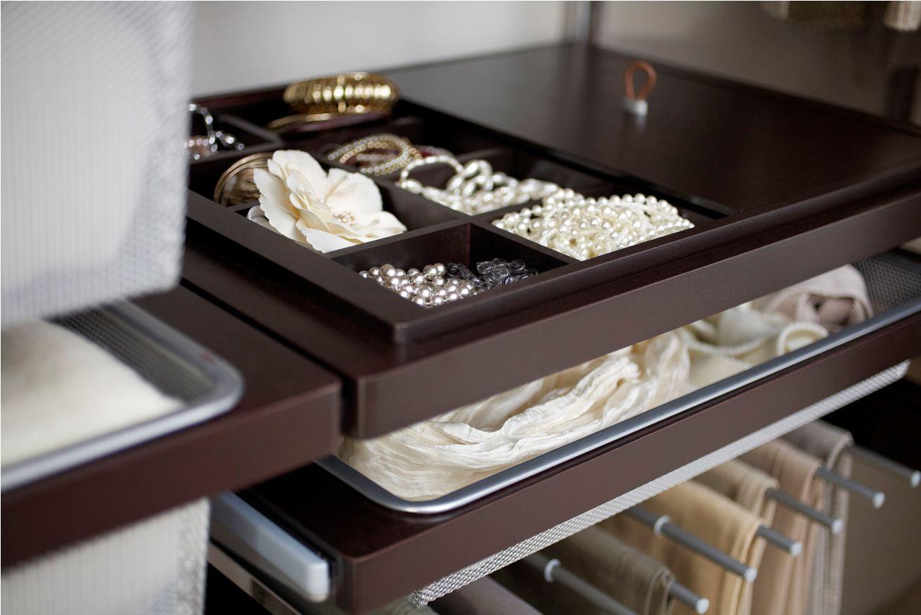 Rozwiązania elfa pozwalają na optymalne wykorzystanie przestrzeni. Dzięki ujednoliconym rozmiarom, kosze, półki i wieszaki można dowolnie ze sobą komponować, zależnie od potrzeb i rodzajów ubrań. Eksperci Elfa nie zapomnieli również o elementach do przechowywania dodatków, bo to właśnie one przez kolejne tygodnie będą najważniejsze. Krawaty, apaszki i naszyjniki znajdą swoje miejsce na wieszaku w kształcie dwustronnego grzebienia z linii Classic, a w przechowywaniu bransolet i zegarków sprawdzą się płytkie, drewniane półki elfa Décor. Możesz dobrać do nich przegrody: 8 lub 24-komorowe, dzięki czemu nawet takie drobiazgi jak kolczyki czy pierścionki będą miały swoje miejsce, a dodatkowa przykrywka zabezpieczy je przed wypadaniem. Praktycznym uzupełnienie garderoby są także wieszaki boczne, na który zawsze znajdzie się miejsce na zapasowy pasek czy kapelusz.